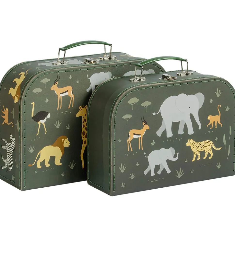 Fint A Little Lovely Company kuffertsæt bestående af to kufferter i mørkegrøn med et alloverprint af savannedyr i forskellige farver.