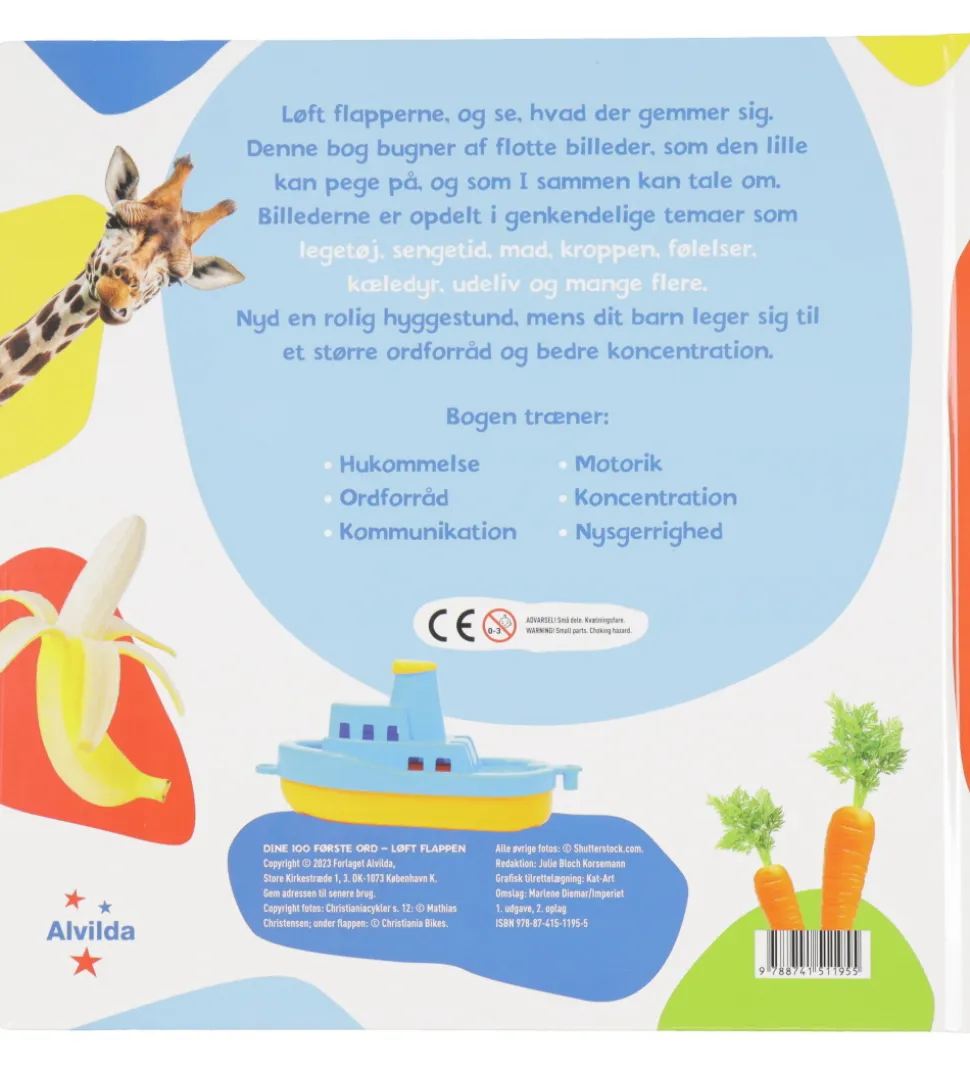 Alvilda bogen er spændende og informativ og udforsker hverdagens elementer med mere end 80 sjove flapper, der inviterer til interaktiv leg og læring. Denne bog stimulerer og træner både nysgerrigheden, hukommelsen, motorikken, ordforrådet, kommunikation og koncentration, mens de opdager genkendelige temaer som legetøj, sengetid, mad, kroppen, følelser, kæledyr, udeliv og mange flere.