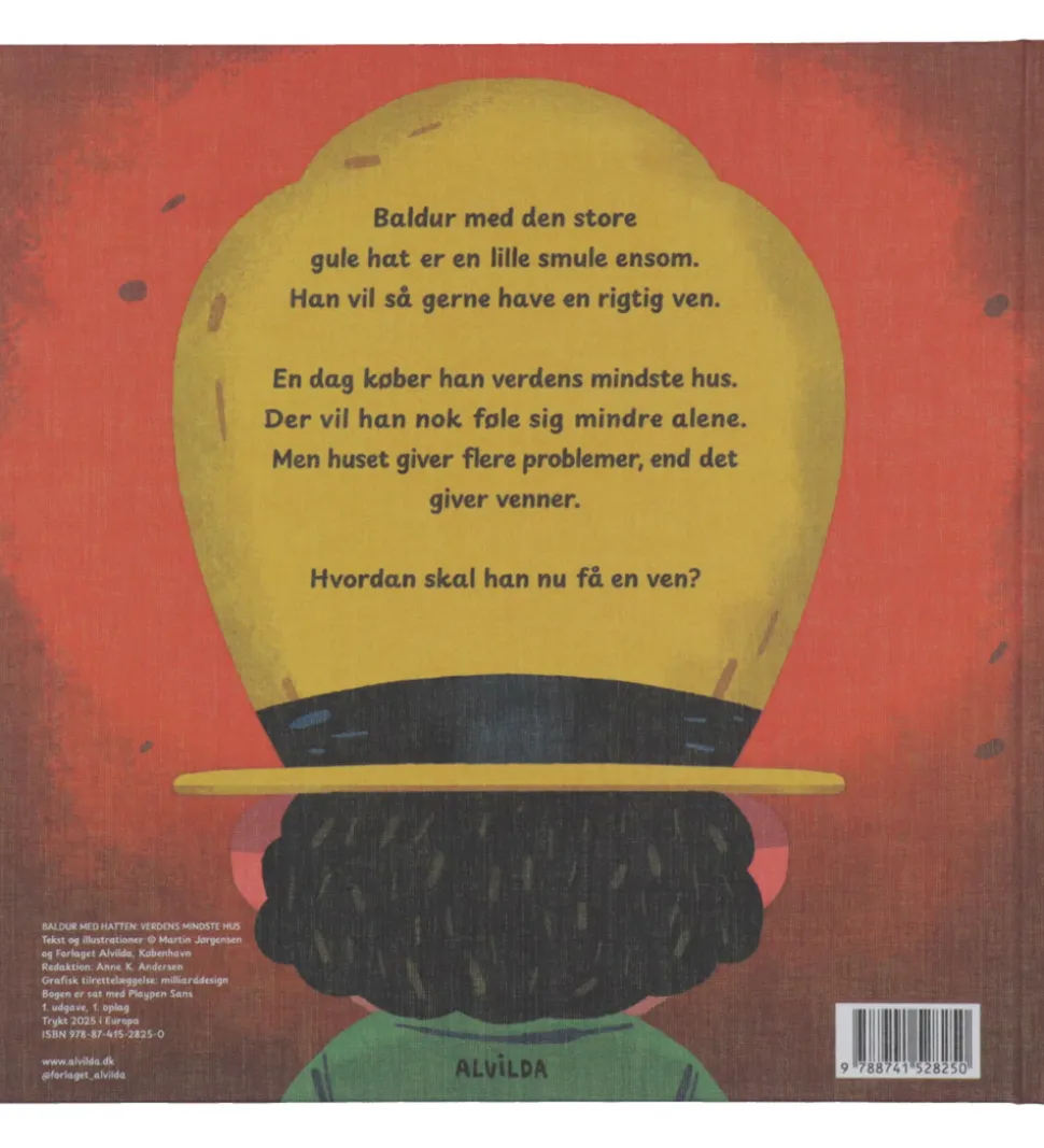 Alvilda bogen er indbundet og rummer 32 sider, der fortæller historien om Baldur med hatten, som køber verdens mindste hus.