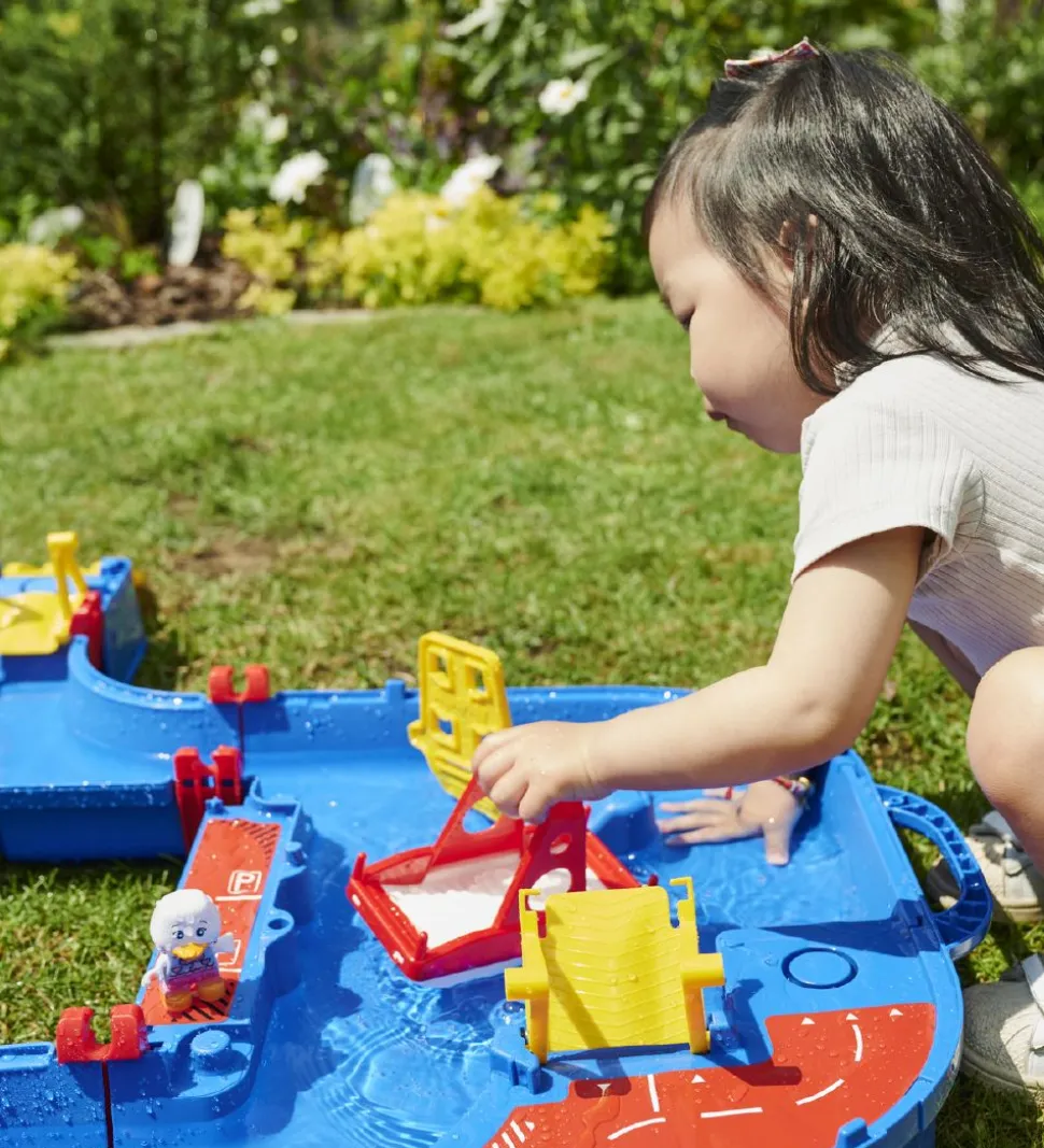 AquaPlay legesættet er beregnet til sjov med vand, hvor alle kan være med. Børnene kan ved hjælp af håndsving, broer, pumper, kran og sluse finde på masser af sjove ting at gøre med vandet. Vandkanalen har brede vandveje og ved at dreje håndsvinget kan bådene sejle rundt. Sættet stimulerer børnenes kreativitet og fantasi.