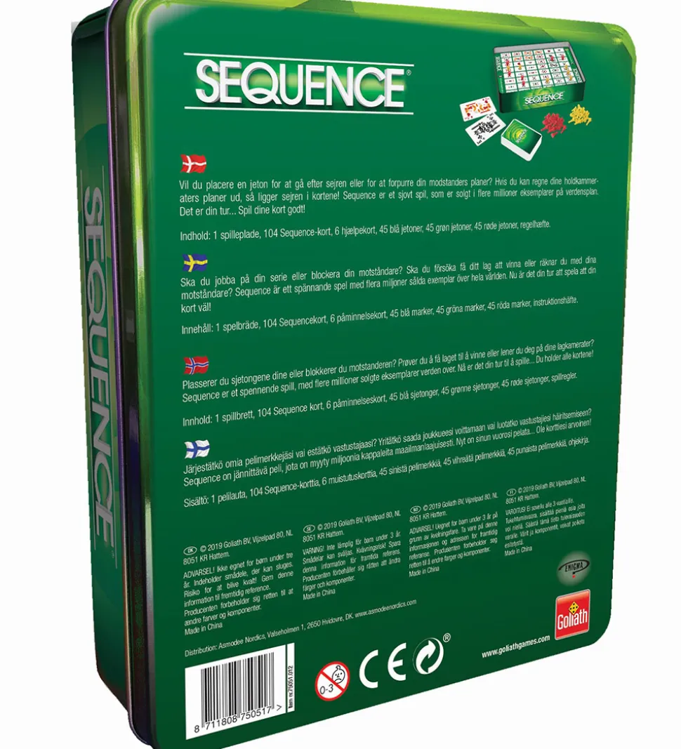 Sjovt Sequence brætspil, hvor det gælder om lave sekvenser og forpurre modstanderens planer, i en rejseudgave med pinde i stedet for jetoner.