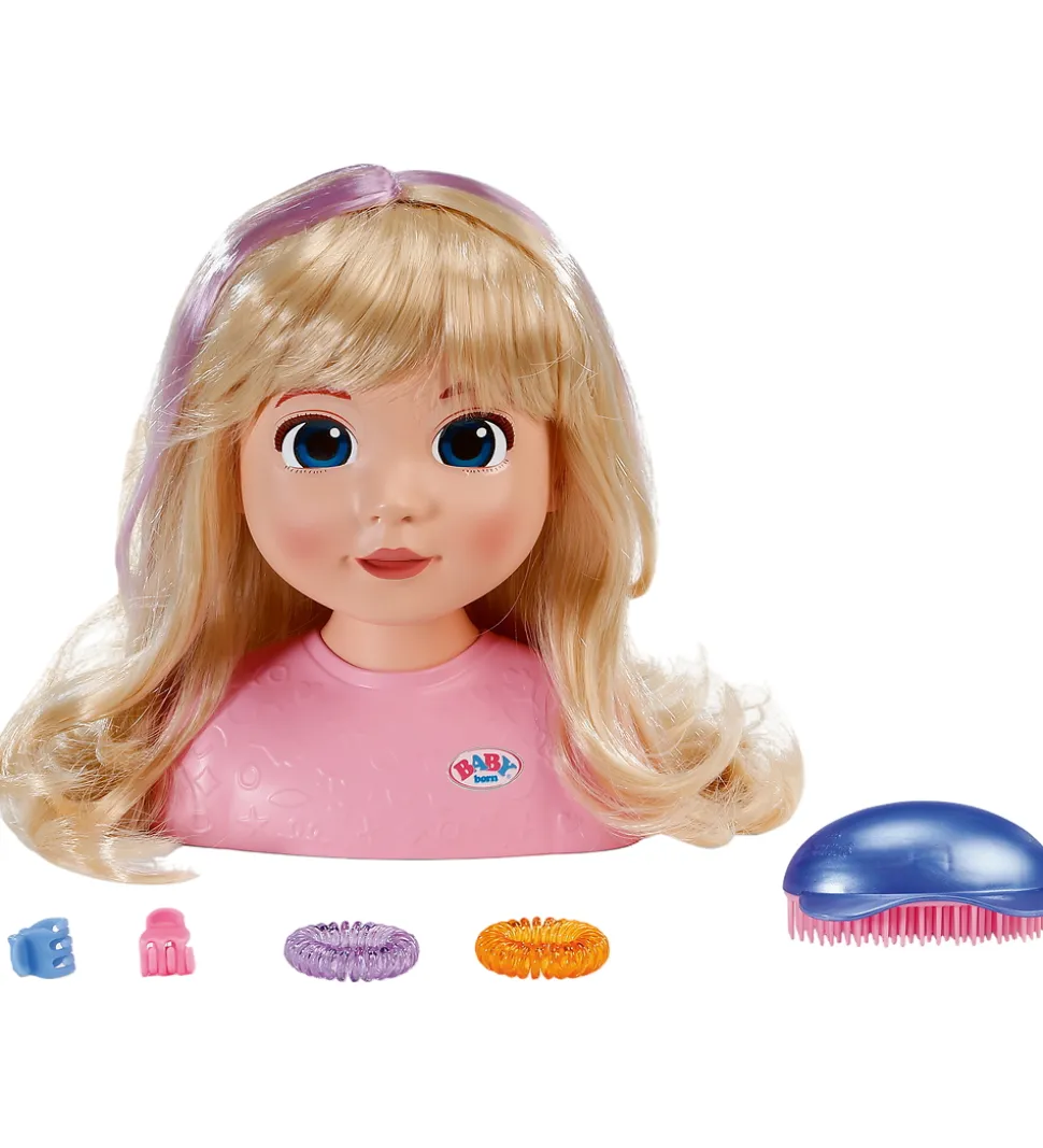 Charmerende BABY Born dukkehoved med langt, lyst hår og masser af medfølgende tilbehør. Baby Born dukkehovedet er pefekt til de kreative små, som elsker at lege stylist og sætte hår i flotte frisurer.