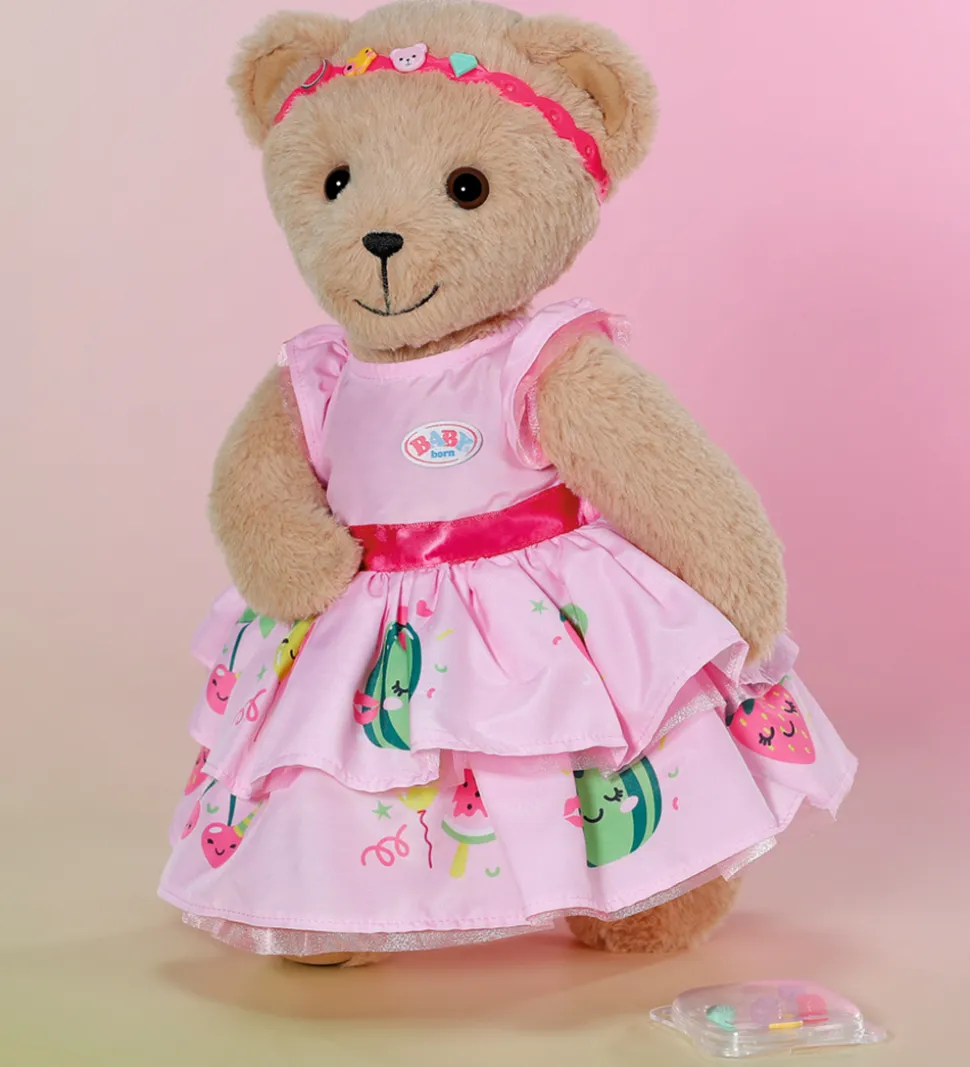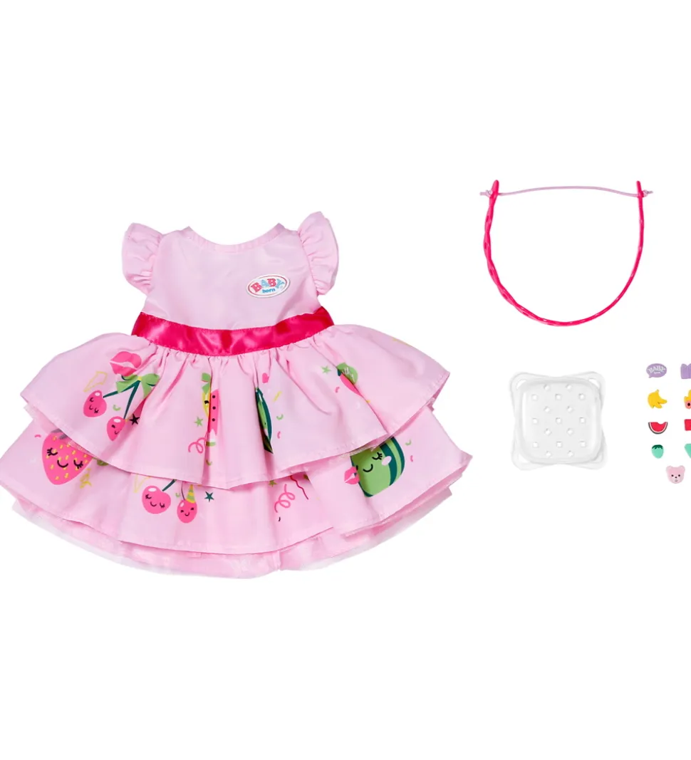 Skøn BABY born dukketøj i form af en pink kjole med frugtprint. Sættet inkluderer også en hårbøjle, som kan styles med sjove applikationer, der også følger med.
