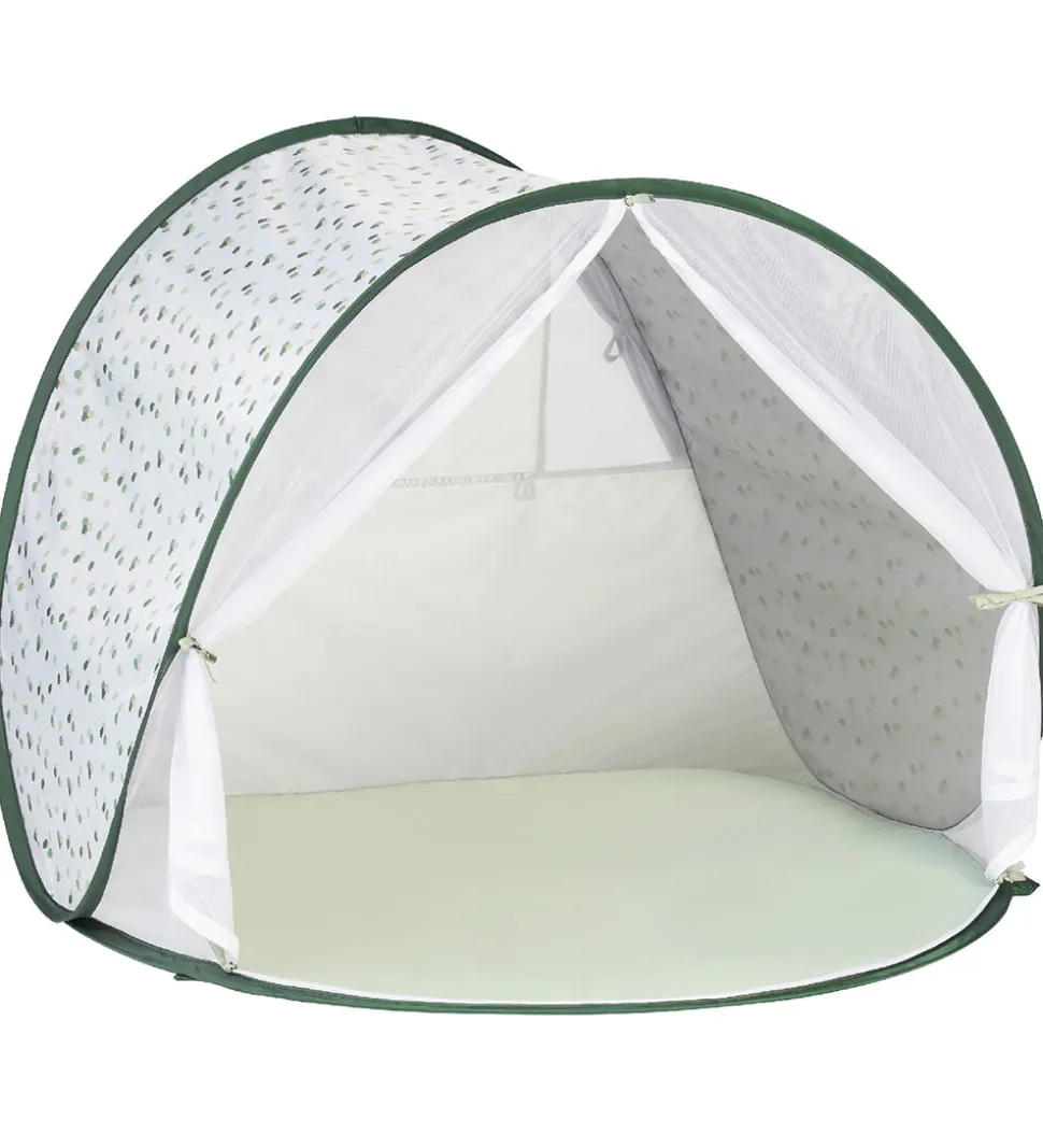 Flot Babymoov pop-op-telt i hvid med prikker i grønne nuancer.