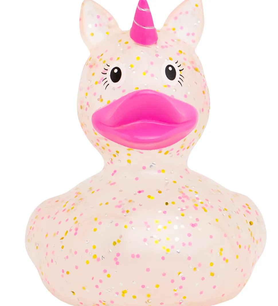 Sød badeand i gennemsigtig rosa med glimmer, i form af en enhjørning.