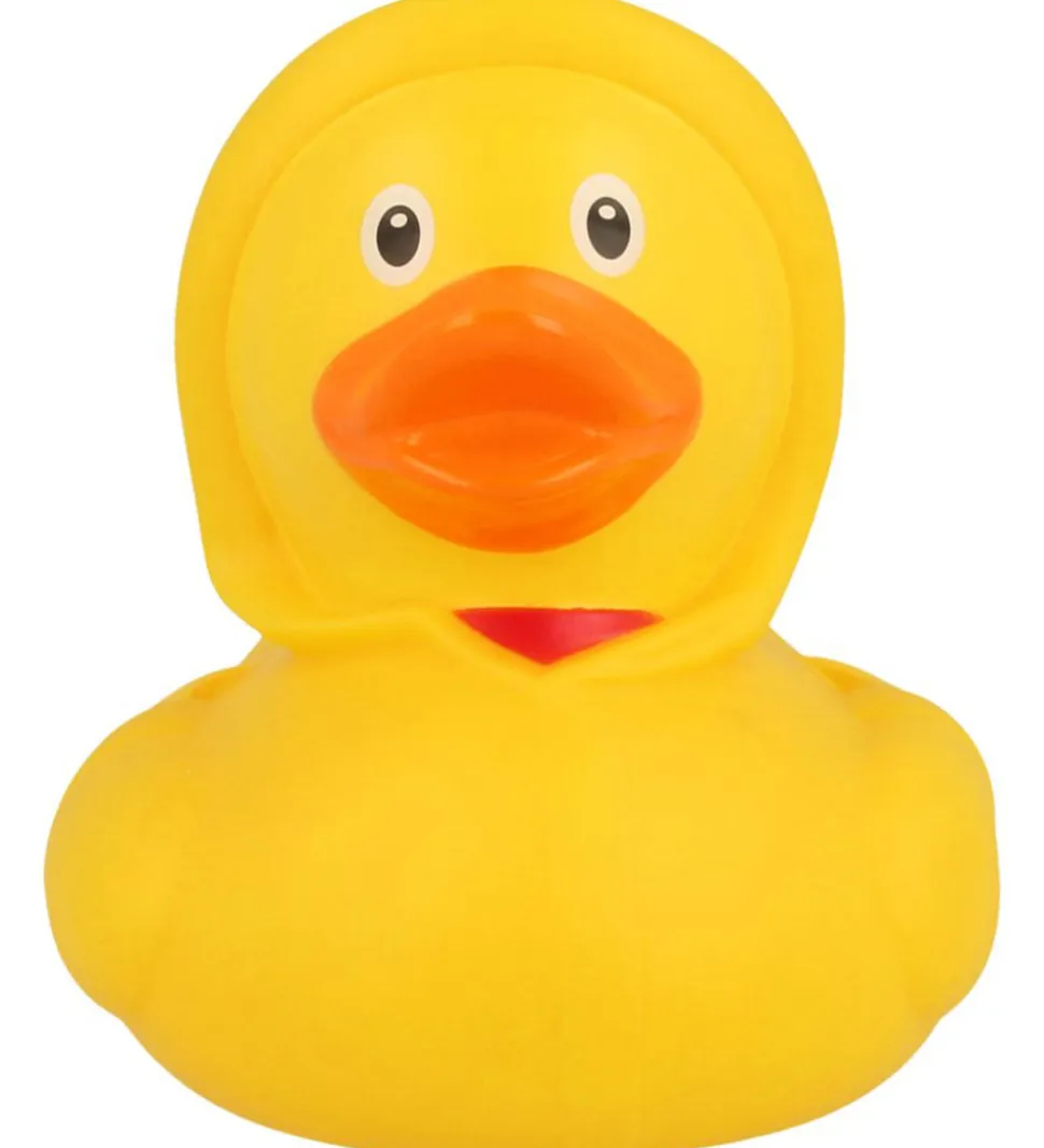 Skøn badeand i gul som forestiller at have en regnjakke på.