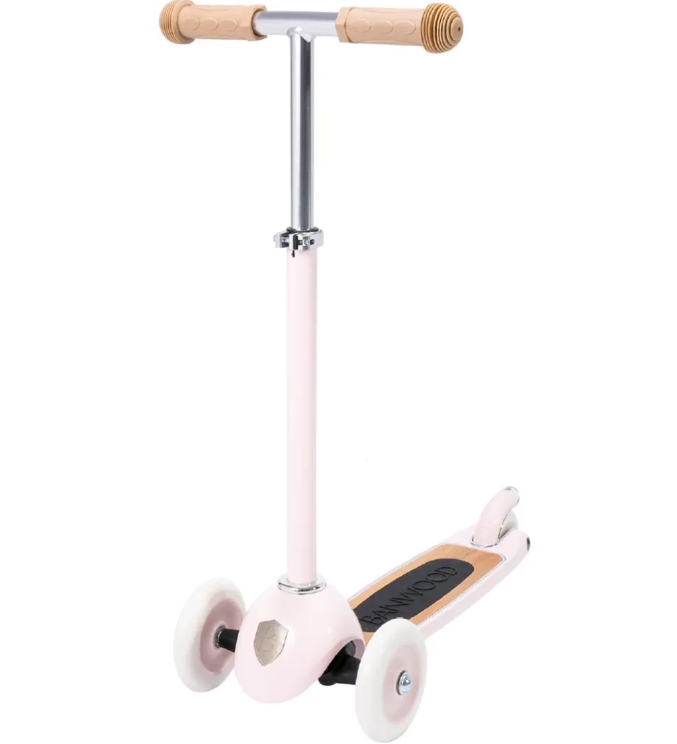 Banwood løbehjulet har to store hjul foran og et lille hjul bagpå med en fodbremse. Løbehjulet har en bred plade af eg med en sort gummistribe til at stå på, så barnet står stabilt. Styret kan justeres i tre højder, og det har håndtag af gummi, som giver et godt greb.