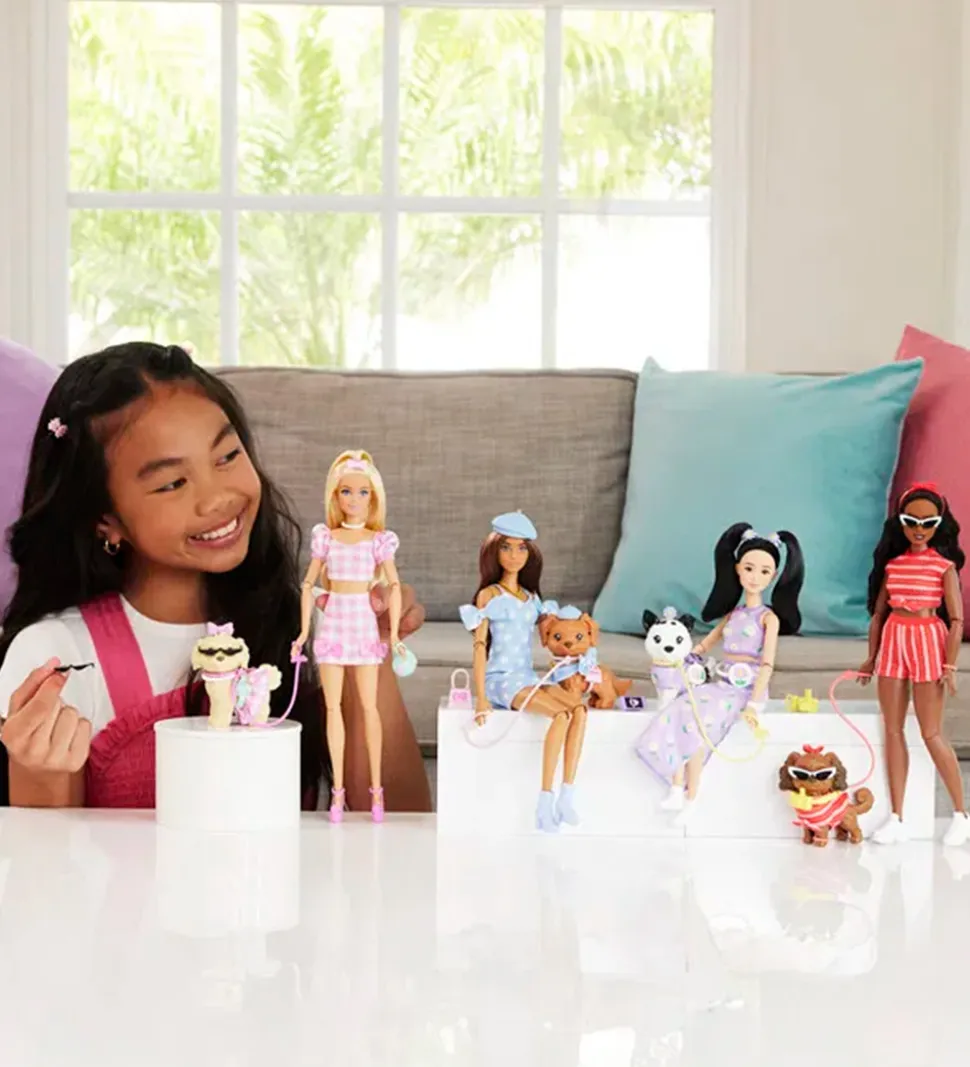 Flot Barbie dukke klædt i et charmerende, blåt sæt med hvide prikker. Barbie dukken inkluderer en sød hund med matchende accessories.