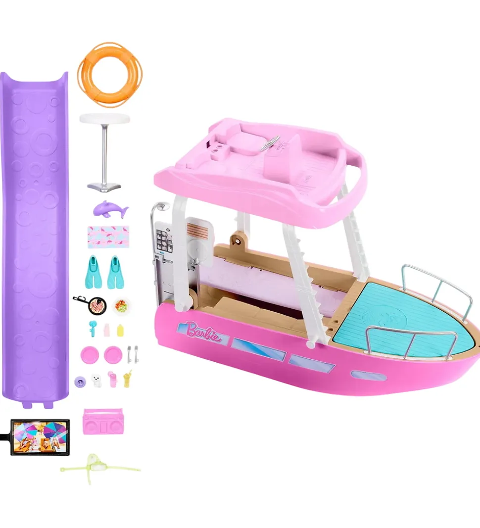 Fantastisk Barbie legetøj i form af en pink båd og en masse tilbehør. Legetøjet består af mere end 20 dele, så dukkerne bl.a. kan lave mad, rutsche, bade og slappe af i solen. Barbie legetøjet har mange fine detaljer og indbyder til fantasifulde lege.