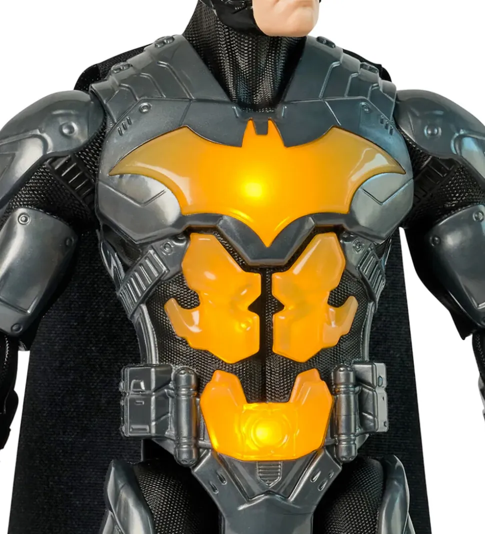 Fantastisk Batman actionfigur i mørkegrå med sorte detaljer og et gult logo på brystet, som kan lyse op. Batman actionfiguren er designet med imponerende detaljer, og kan afspille 24 forskellige lyde og sætninger, når den trykkes på brystet. Actionsfiguren har bevægelige led, så den kan stå i forskellige positurer.