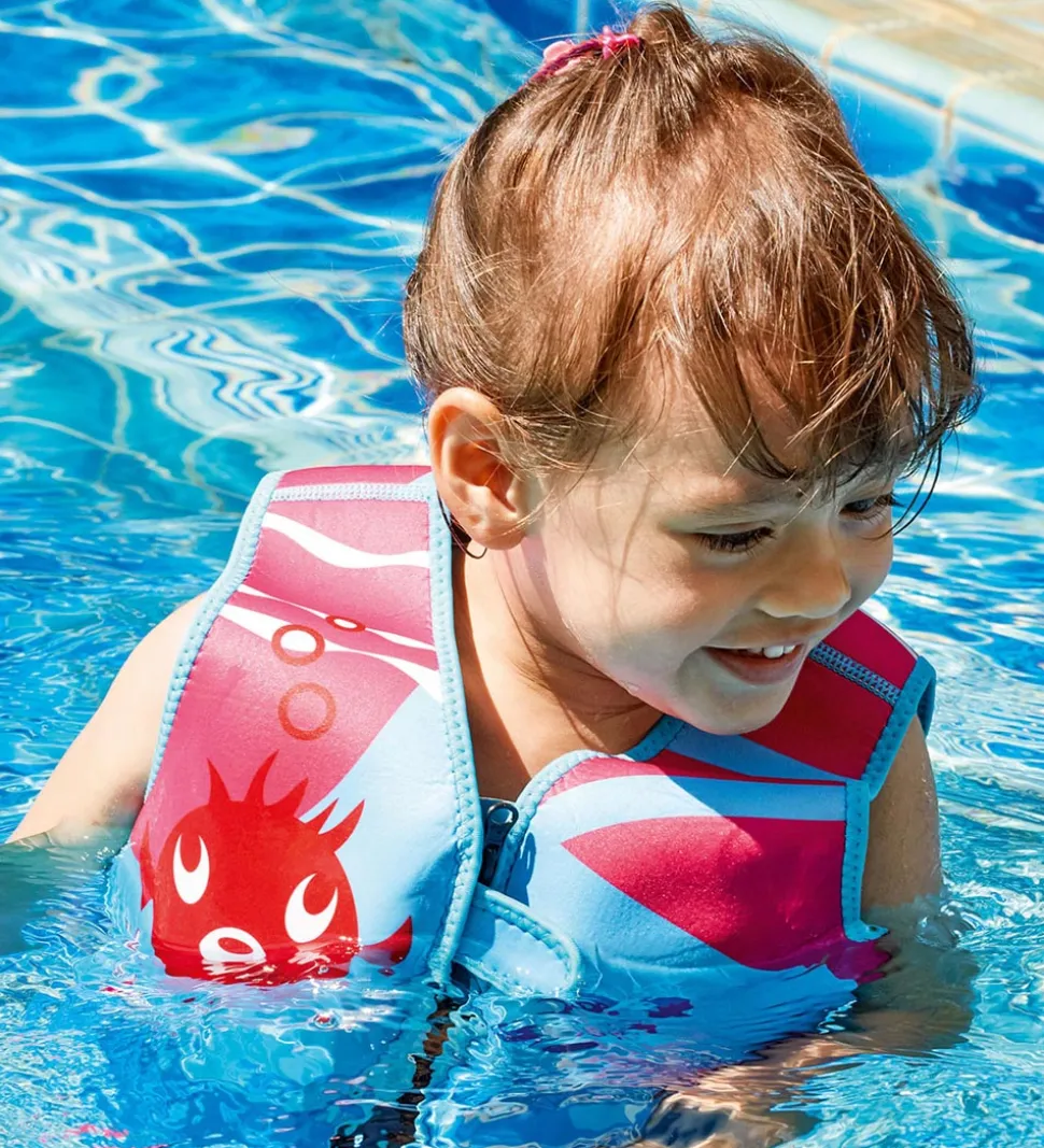 Svømmevesten er lavet af neopren med skum indvendigt, så det kan holde barnet op til vandoverfladen.