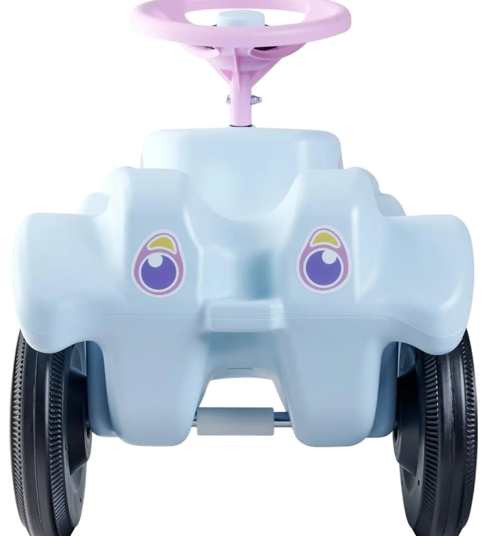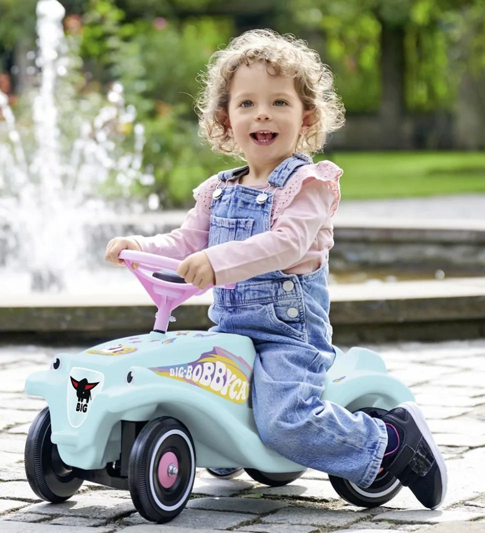 Sød BIG bil i lyseblå med rosa detaljer, print med enhjørningetema og et stort logoprint på siderne. Bilen er af modellen Big Bobby Car Classic.