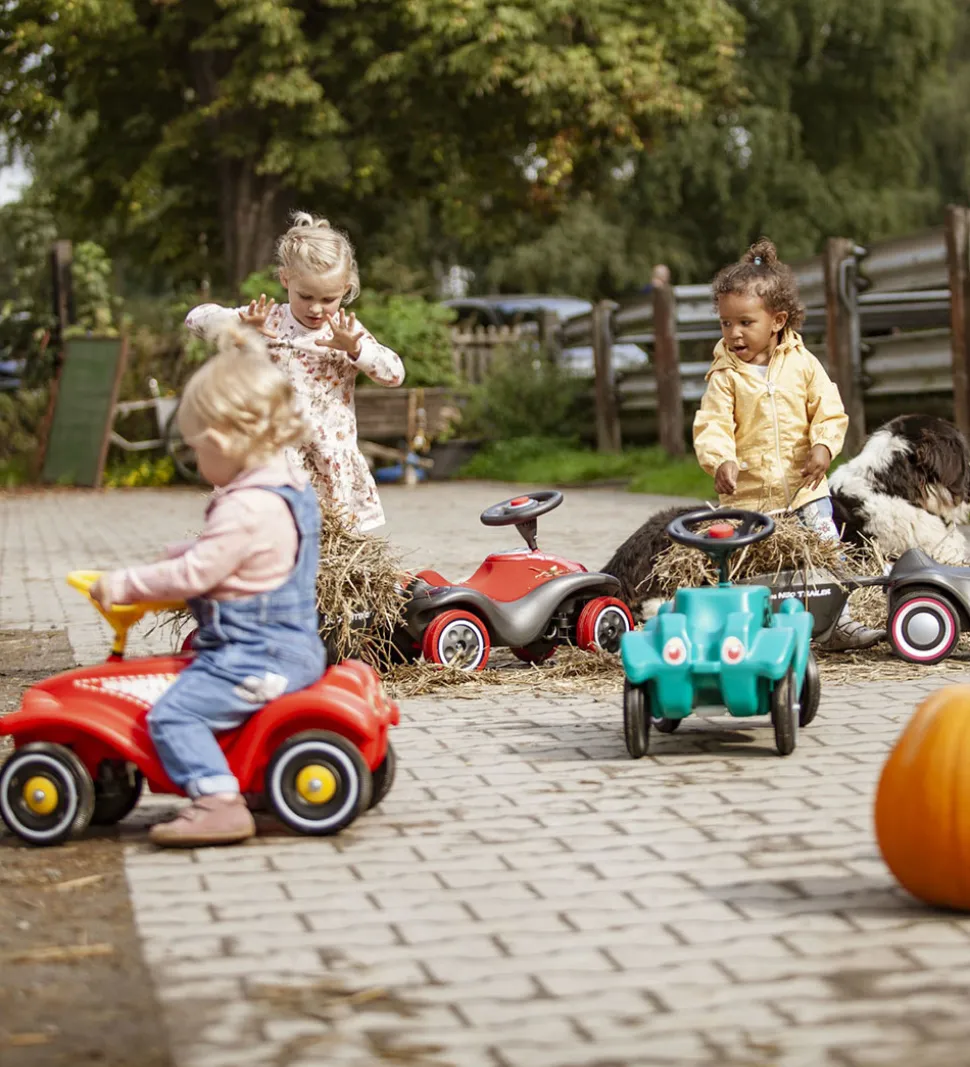 Bilen har et aftageligt anhængertræk foran og et fast anhængertræk bagpå, som muliggør montering af Big tilbehør og anhængere. Der medfølger udskiftelige fælgringe og dæksel til horn i turkisblå og pink. Bilen kan bruges både indendørs og udendørs.
