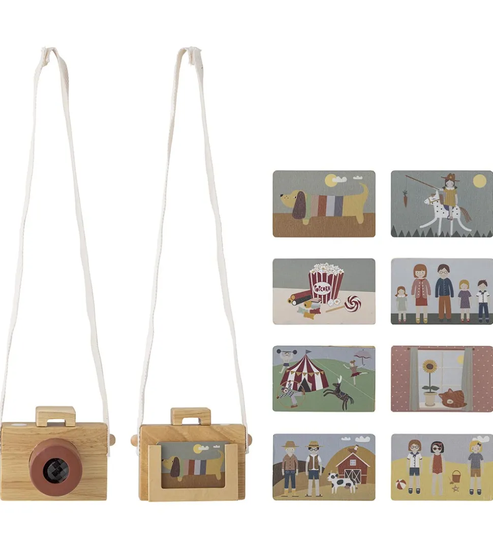 Bloomingville Mini legetøjskameraet er sjovt at lege med for den lille, nysgerrige fotograf, der kan bære kameraet om halsen med den lange rem, der åbnes og lukkes med velcro. Der med følger fire billeder i træ, hvor der er motiv på begge sider, og billederne kan en ad gangen sættes i kameraet.