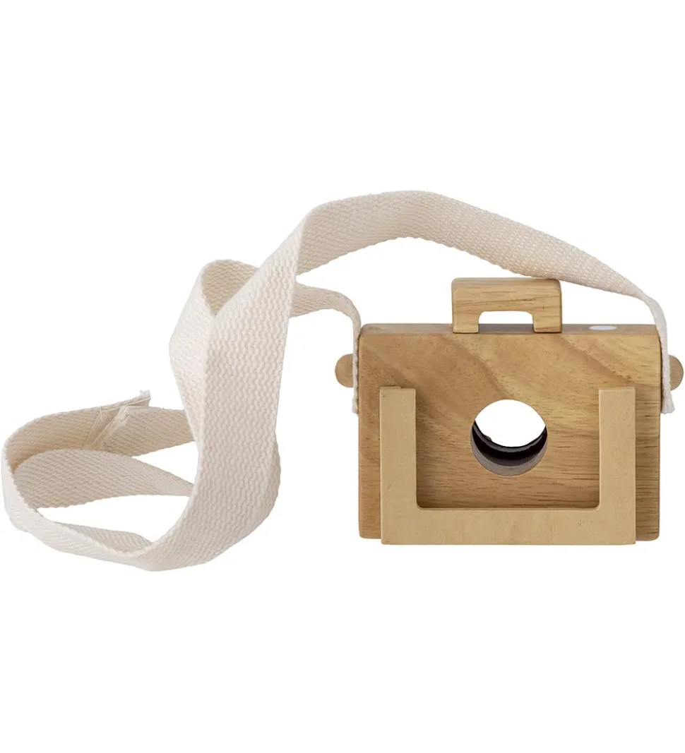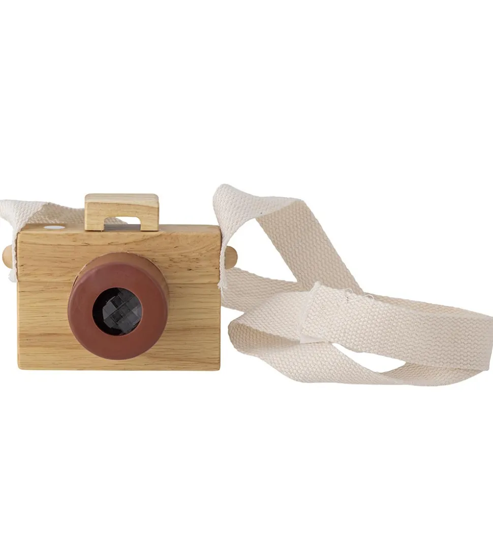 Sjovt Bloomingville Mini legetøjskamera i træ og med en hvid rem.
