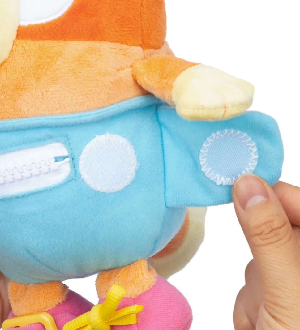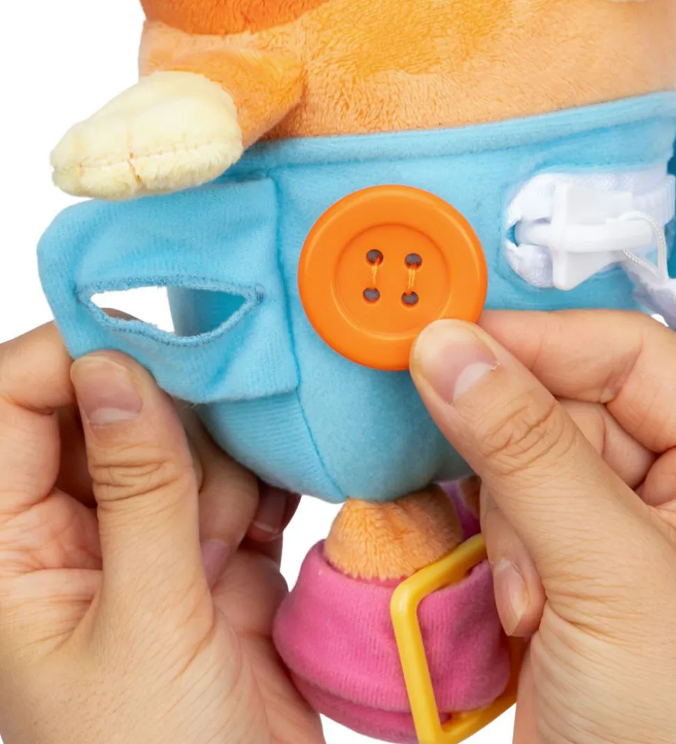 Charmerende Bluey bamse i form af Bingo i orange med blå bukser og pink sko. Bingo har bukser og sko med forskellige funktioner, så man kan øve sig i bl.a. at knappe, binde og lyne en lynlås. Bingo har et sødt ansigt og er super blød at røre ved.