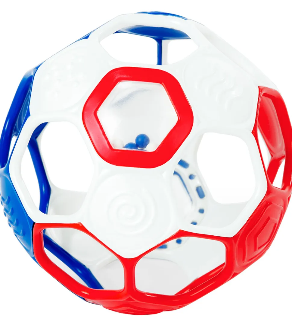 Sjov Bright Starts aktivitetslegetøj som forestiller en fodbold i hvid, blå og rød.