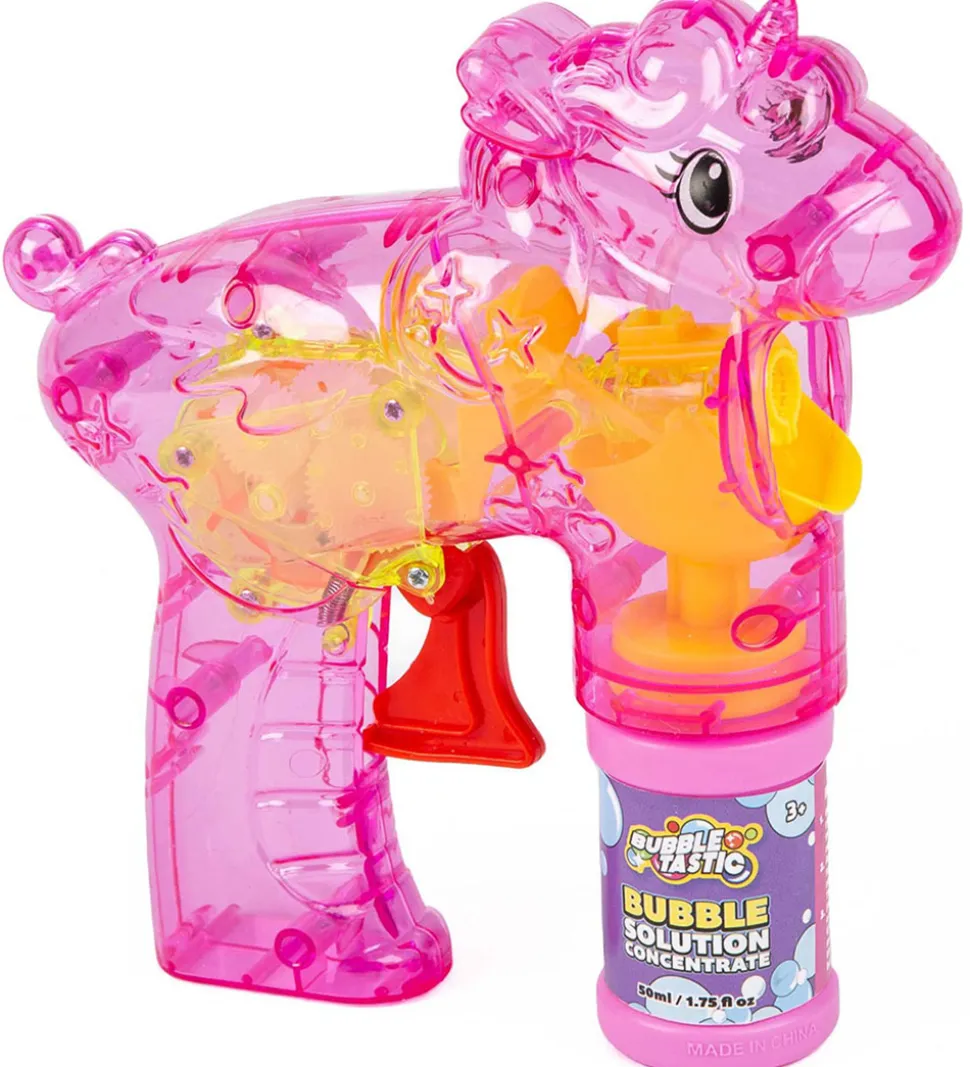 Underholdende sæbeboblemaskine fra Bubbles i en gennemsigtig lyserød og med seje lyseffekter. Sæbeboblemaskine er formet som en enhjørning og designet til at sprøjte bobler. Sæbeboblesættet indeholder en pose med sæbe, så den er klar til brug med det samme.
