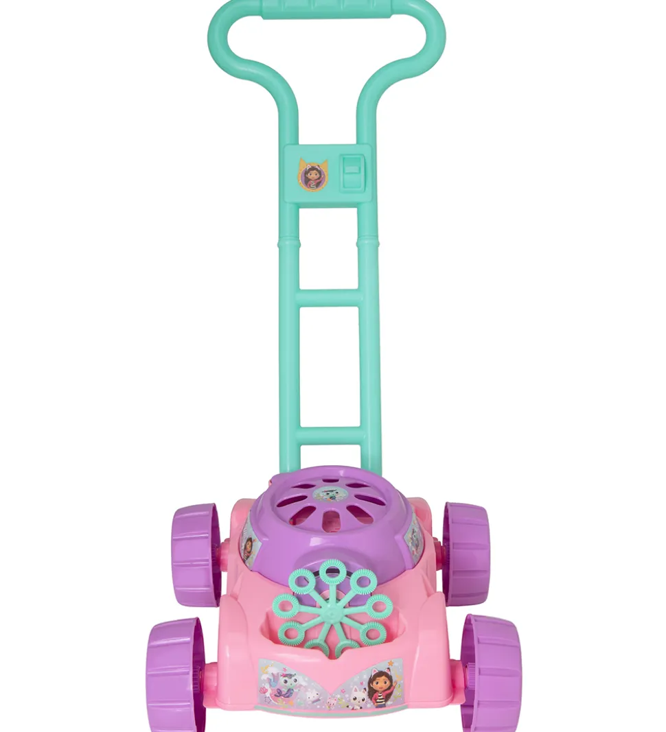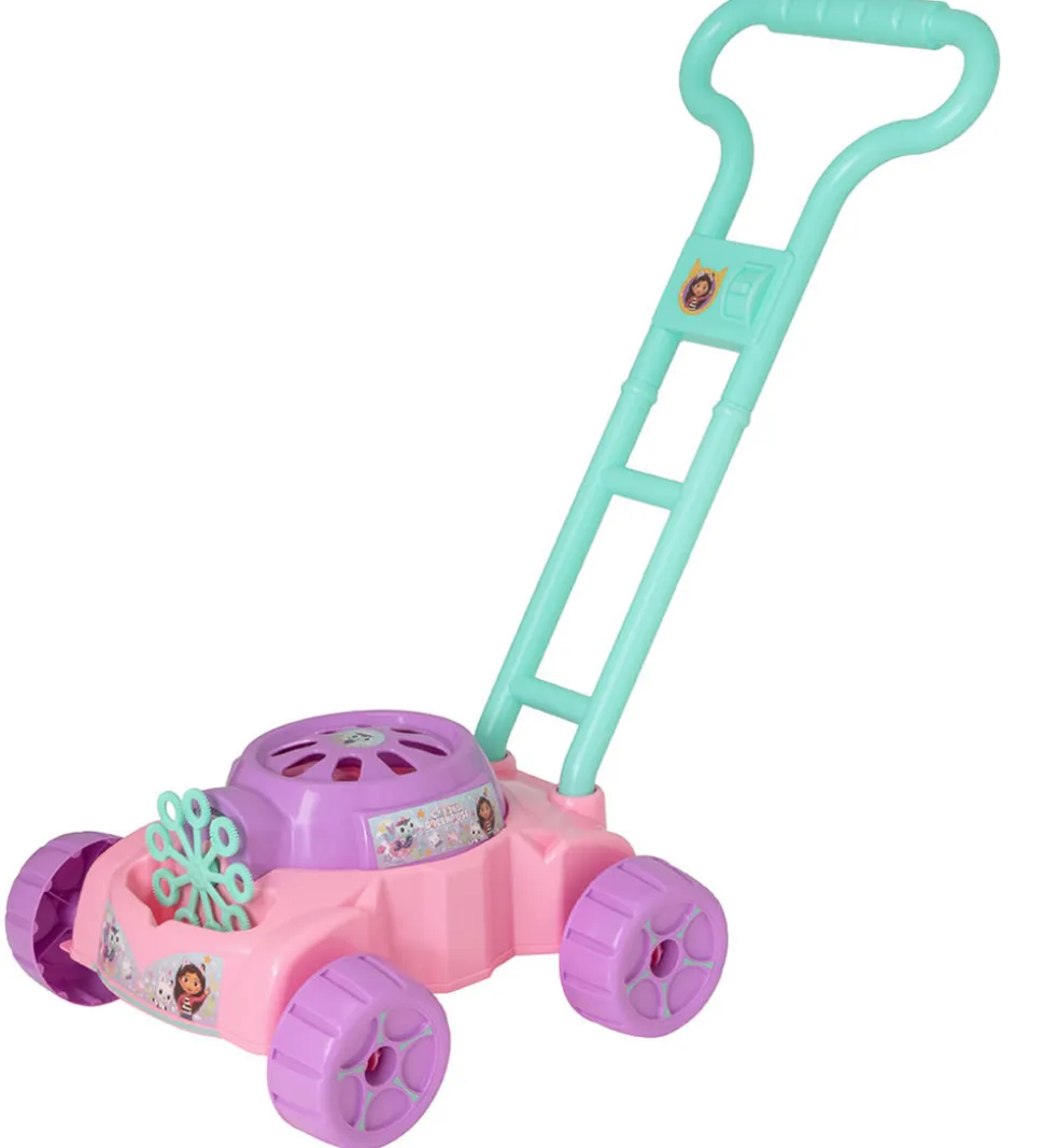Sjovt Bubbles sæbeboblemaskine der ligner en plæneklipper, med et flot Gabby’s Dollhouse tema.