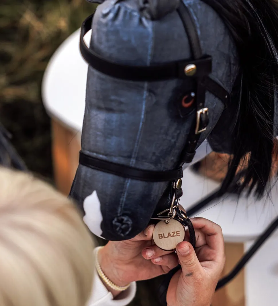 by ASTRUP kæphesten har sort hovedtøj på, som kan tages af og på. På den ene side af hovedtøjet sidder et rundt navneskilt med navnet “Blaze” på den ene side og by ASTRUPs logo på den anden side. Kæphesten har et blødt hoved med en manke af nylon som kan friseres og sættes i flotte frisurer. Kæphesten er skabt til fantasifulde og kreative lege.