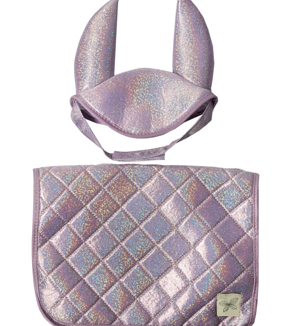 Smart by ASTRUP sadelunderlag og hut til brandets flotte kæpheste. Sadelunderlaget og hutten er i lilla med skinnende glimmer.