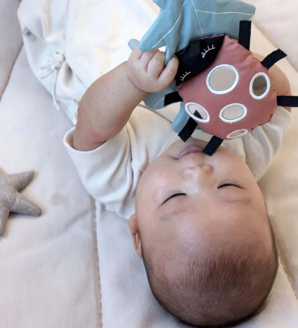Cam Cam Copenhagen aktivitetslegetøjet har massere at udforske for de små, som f.eks. små babyspejle, knitrende papir og små nuller-tags. I toppen er der en god strop som lukkes med velcro, så den kan hænges op lige hvor det ønskes.