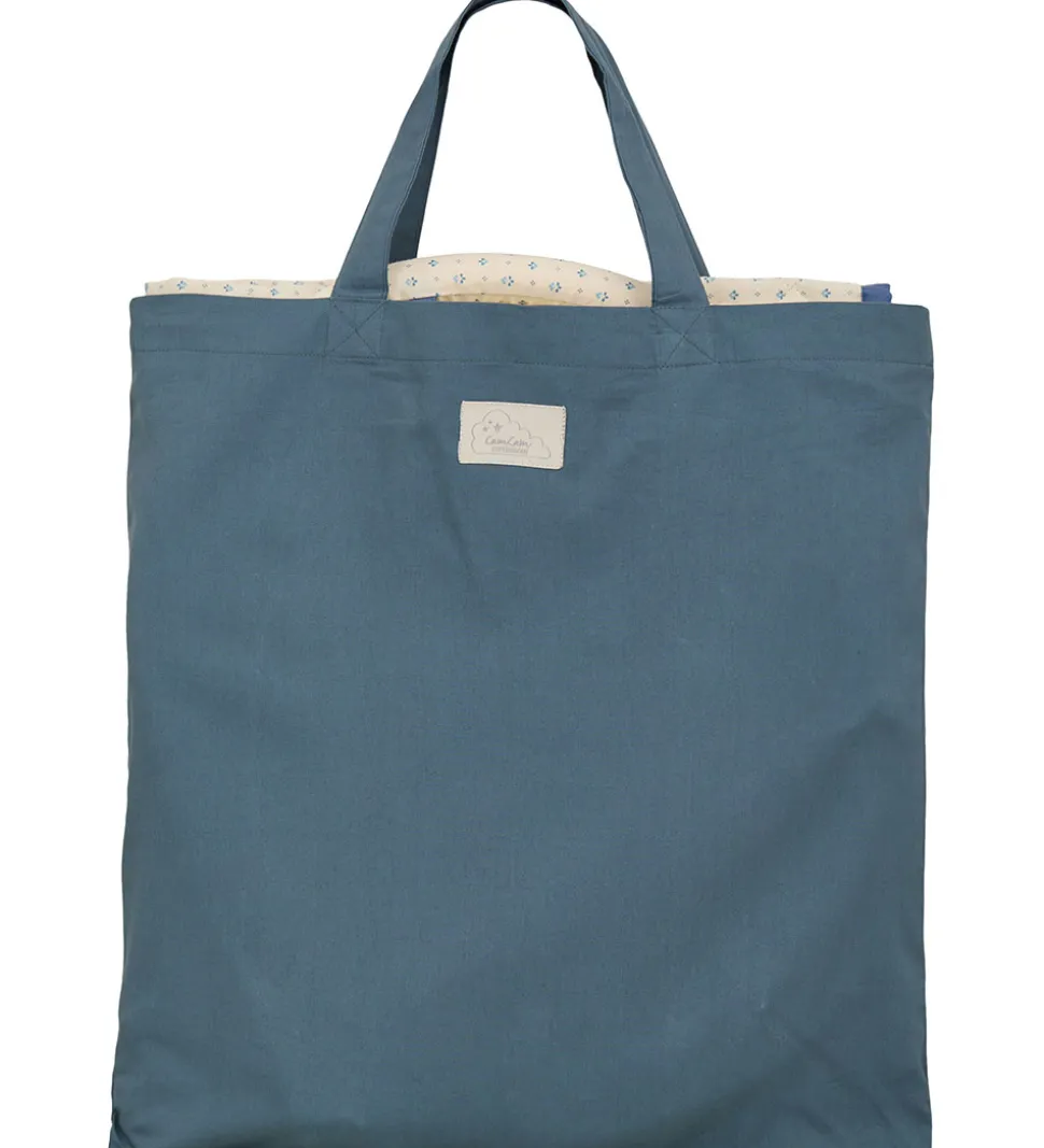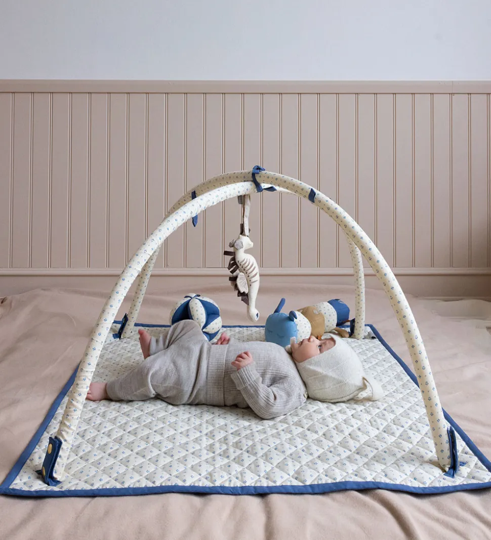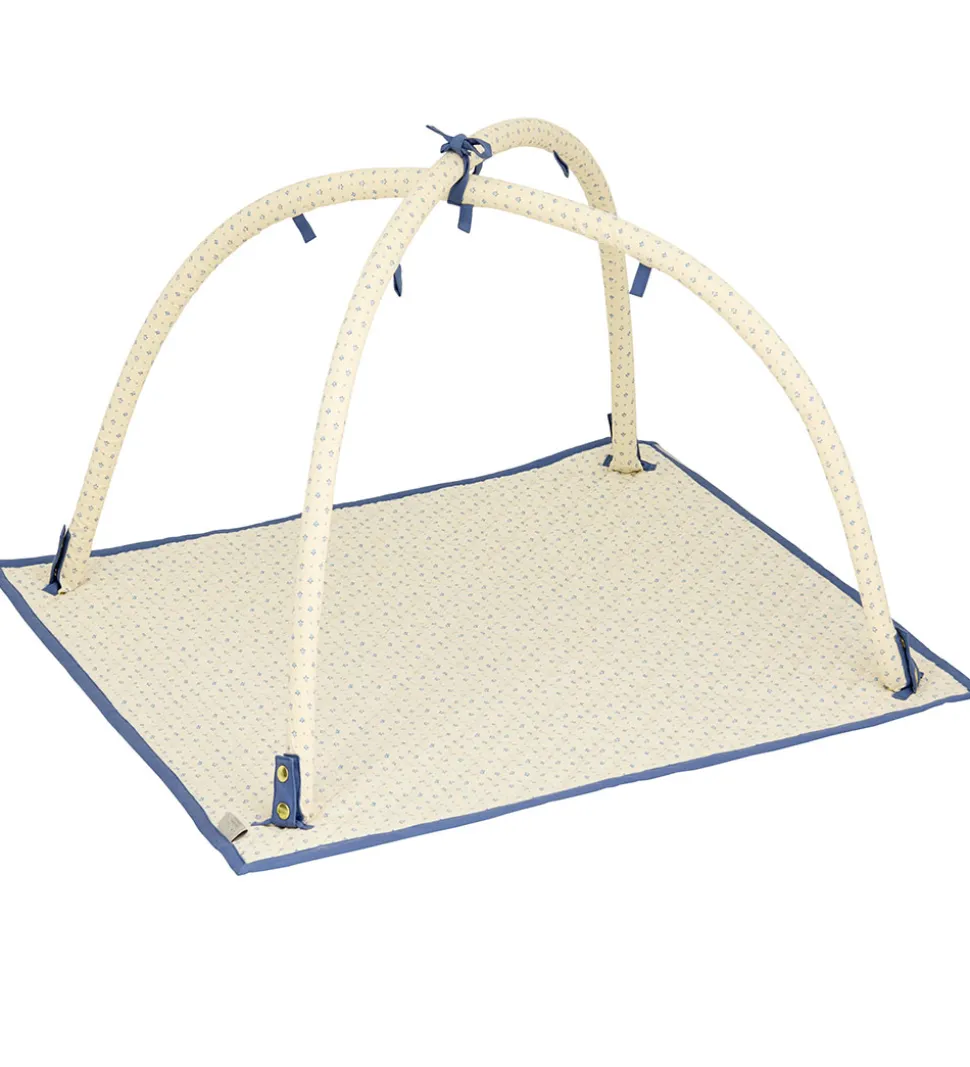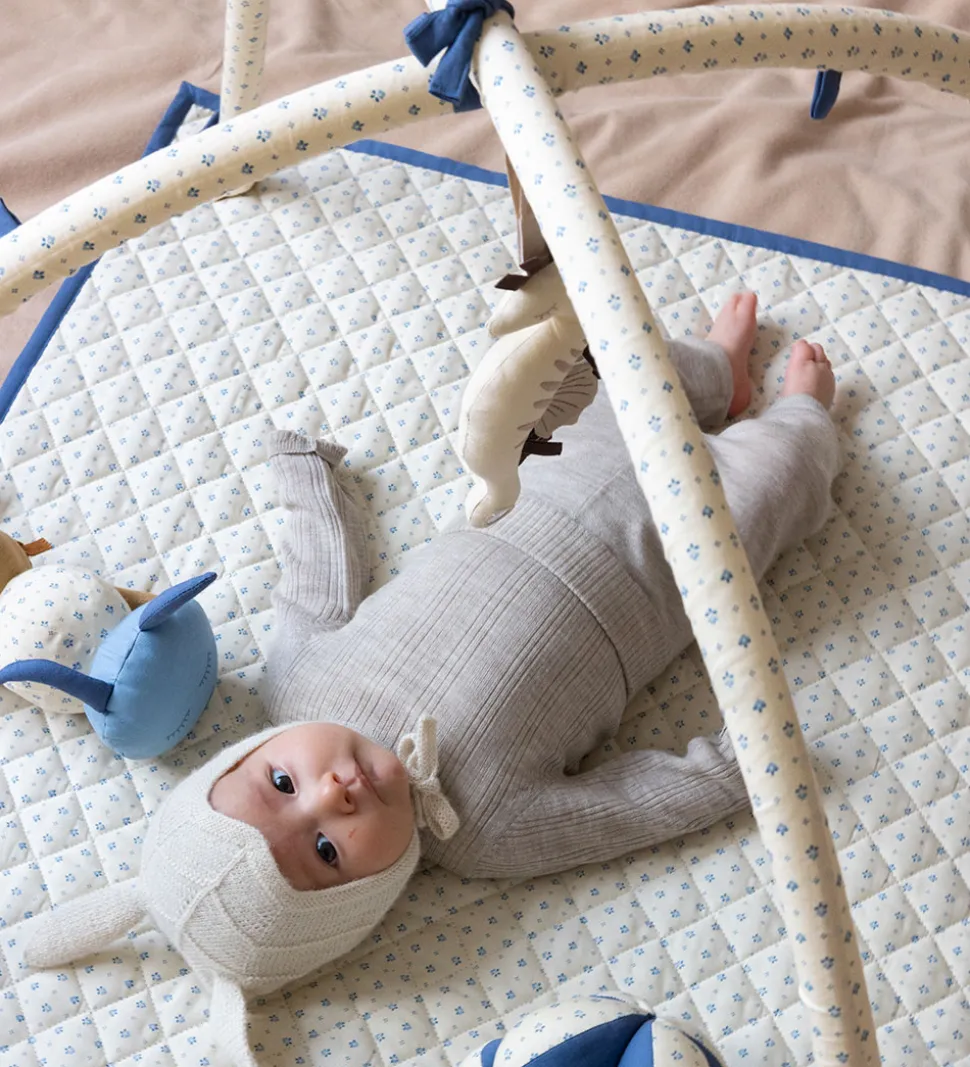 Sødt Cam Cam Copenhagen aktivitetsstativ i beige med et alloverprint af fine, små blomster i blå nuancer.