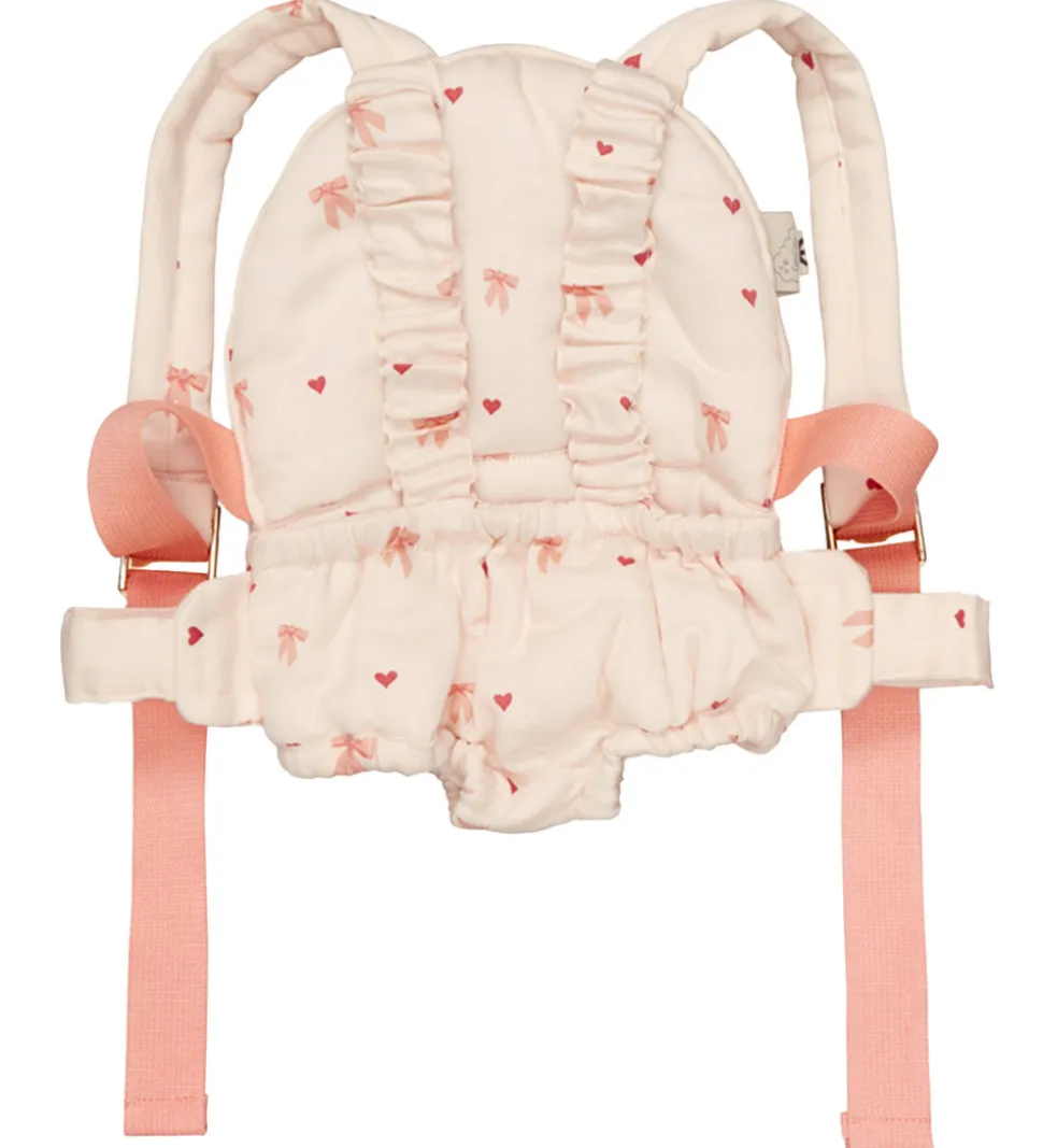 Fin Cam Cam Copenhagen bæresele til dukker i lys rosa et alloverprint af rosa sløjfer og hjerter og rosa remme.