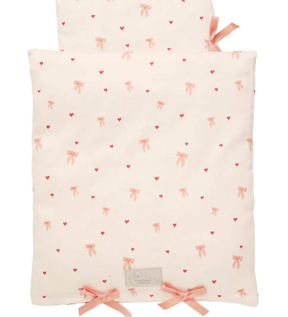 Fint Cam Cam Copenhagen dukkesengetøj i lys rosa med et alloverprint af rosa sløjfer og hjerter og med rosa sløjfer.