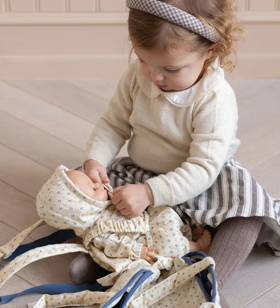 Sødt Cam Cam Copenhagen dukketøj bestående af en kyse, en kjole og et par bloomers. Kysen og kjolen er i beige med et alloverprint af fine, små blomster i blå nuancer. Bloomersene er i ensfarvet blå.