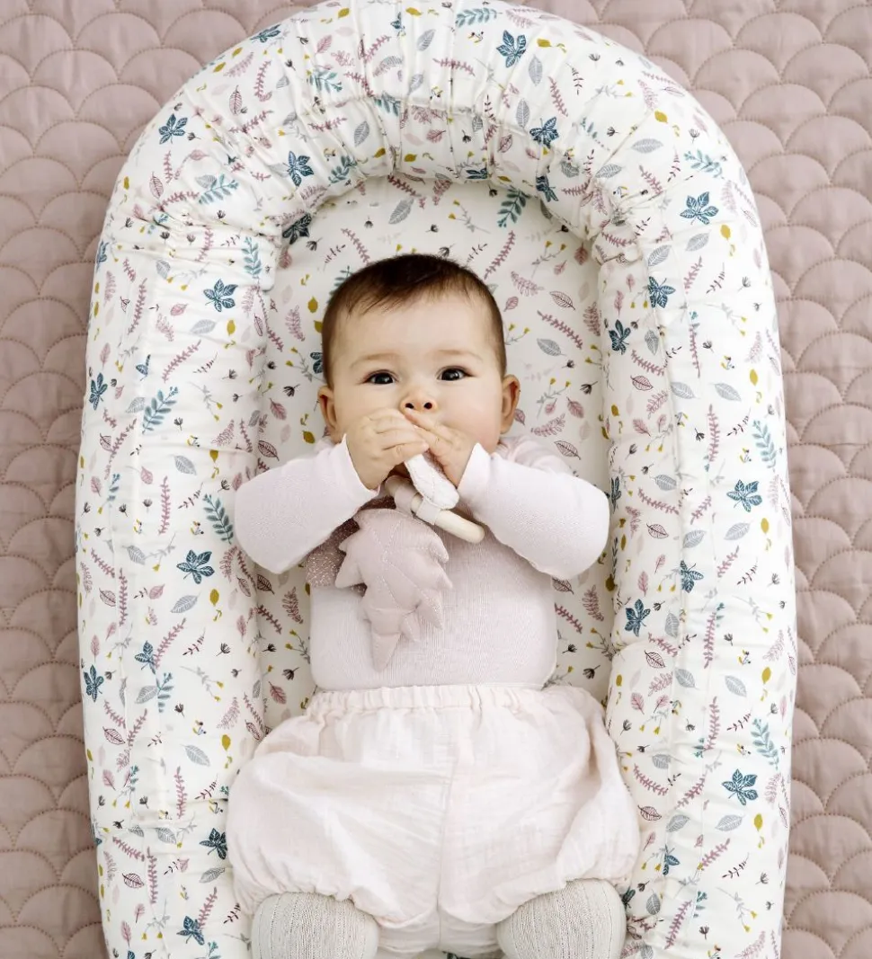 Skøn Cam Cam Copenhagen rangle i lyst træ og med tre blade i forskellige rosa nuancer, med flotte broderede detaljer.