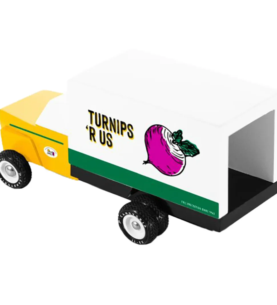 Sej Candylab bil malet som en sjov kålroe-vogn, og på bilens sider står ‘Turnips ‘R US’ i sort.