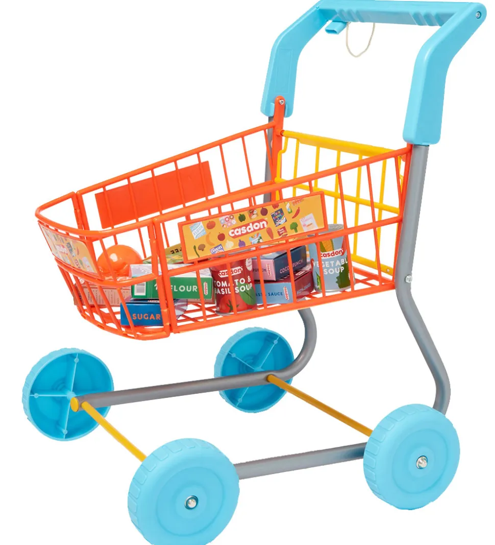 Casdon indkøbsvognen har hjul og håndtag og kommer med 16 forskellige indkøbsvarer, som indkøbsvogn kan fyldes med.