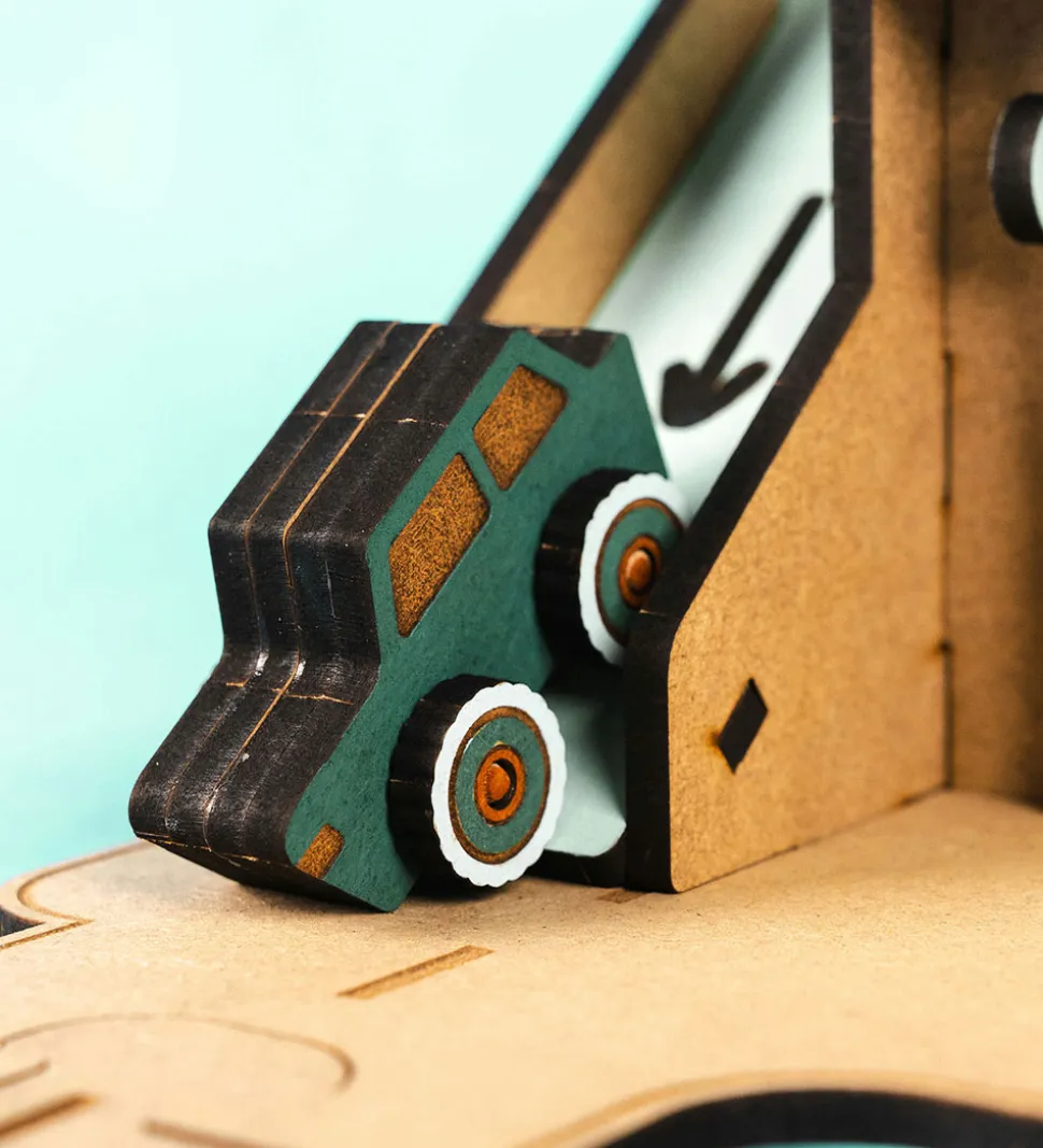 Med Crateit sættet kan du bygge din egen vej med en parkeringszone, samt er træet ufarvet og du skal derfor selv farvelægge det. Det kan farves med alle typer af tusser, maling eller farveblyanter.