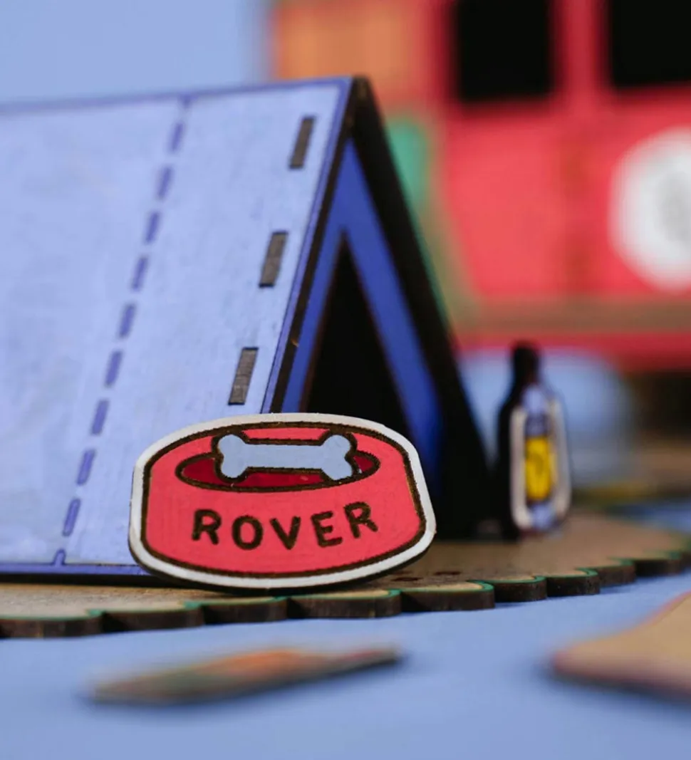 Sejt Crateit kreasæt med motiver til en jeep, et telt og en hund.