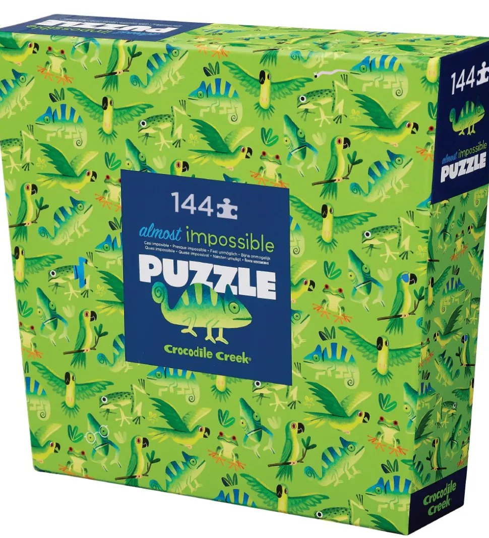 Crocodile Creek puslespillet består af 144 brikker og er mere udfordrende end andre puslespil. Det er nemlig lavet som et alloverprint, hvilket vil sige, at der er mange gentagelser i motivet. Derudover er det samlede puslespil ikke kvadratisk, men har skrå sider, der i sidste ende danner en irregulær firkant.