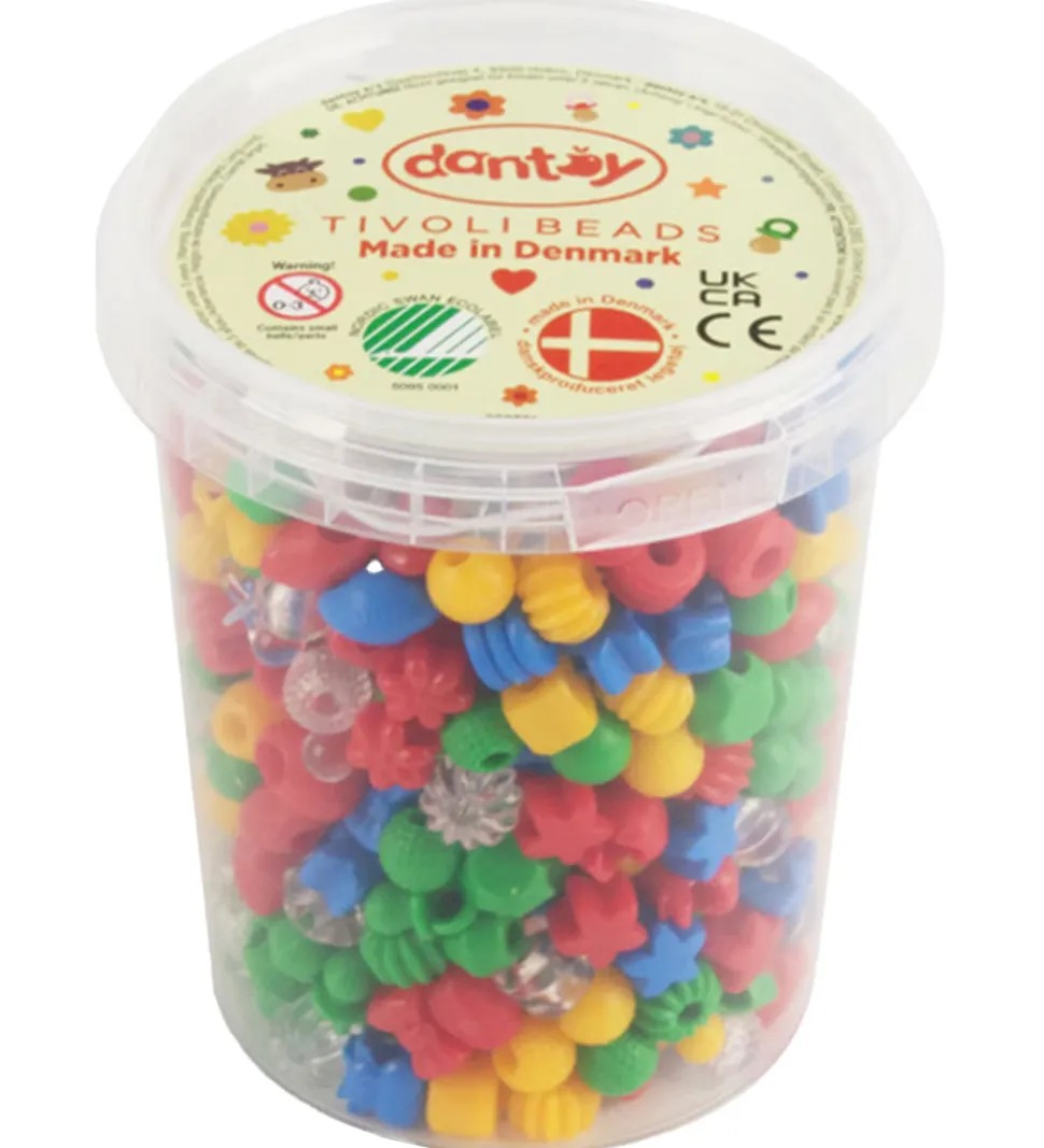 Dantoy perlerne har et stort hul, så de er nemme at sætte på en elastik uden brug af nål. Den medfølgende elastiksnor og perlernes fine farver og former kan bruges til at skabe flotte halskæder, armbånd og meget mere.