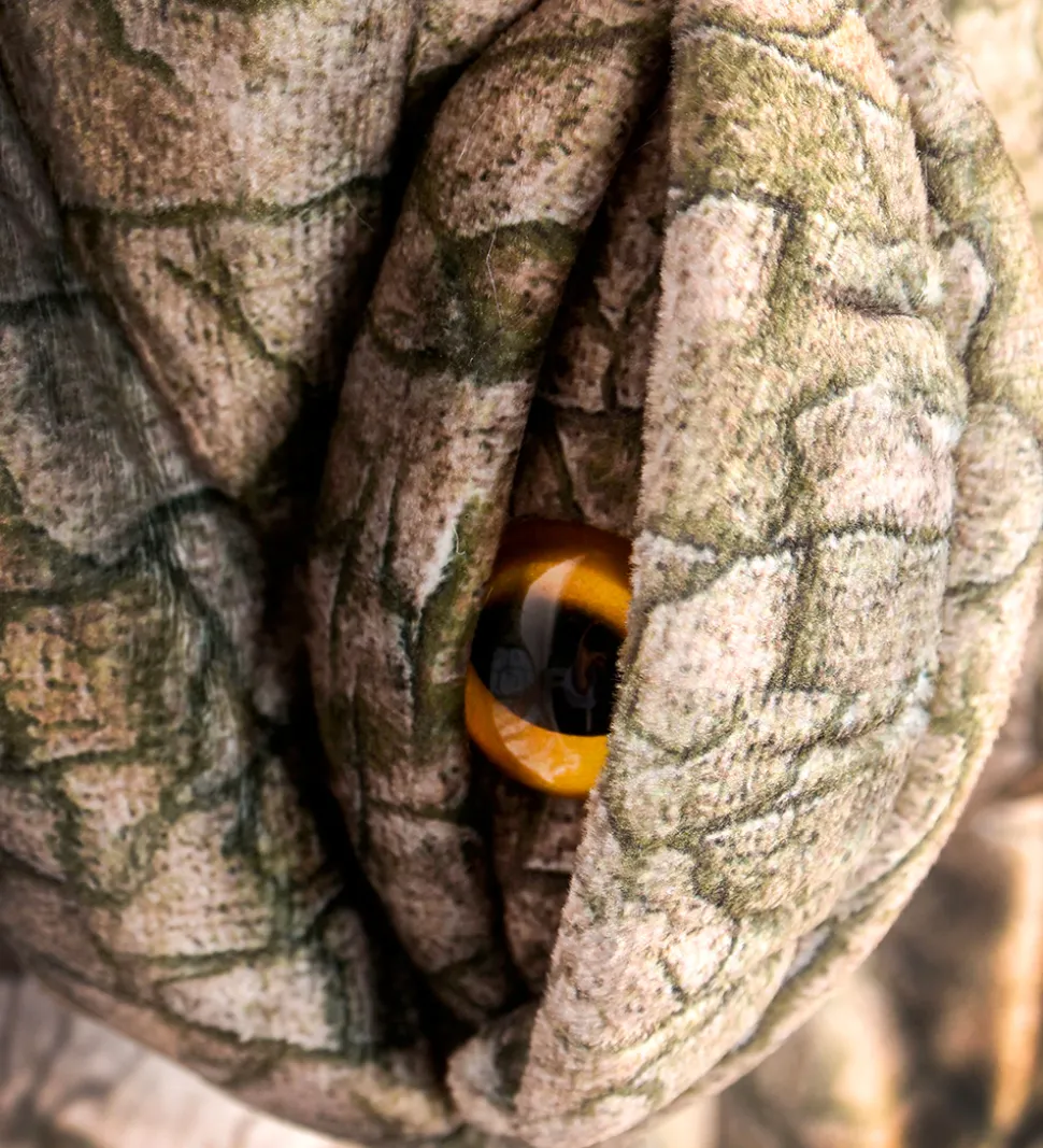 Den Goda Fen dinosaurudklædningen tages på som en heldragt og har en fast hætte, der tages på som dinosaurens hoved med stirrende øjne og sylespidse tænder. Dinosaurdragten åbnes fortil med lynlås fra halsen til livet. I arm- og benåbningerne er der elstikkanter og knivskarpe kløer, der sidder som en polstret klap oven på barnet hænder og fødder. Udklædningen er på ydersiden i flot velour, mens indersiden er i en glatvævet kvalitet.