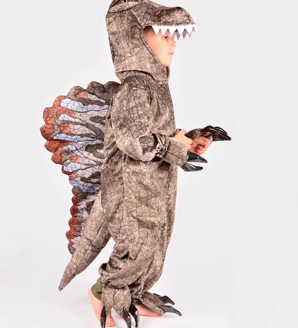 Livagtig Den Goda Fen udklædning, som forestiller en farlig, brun spinosaur med skæl print og skinnende klør samt en lang, polstret hale og rygfinne.