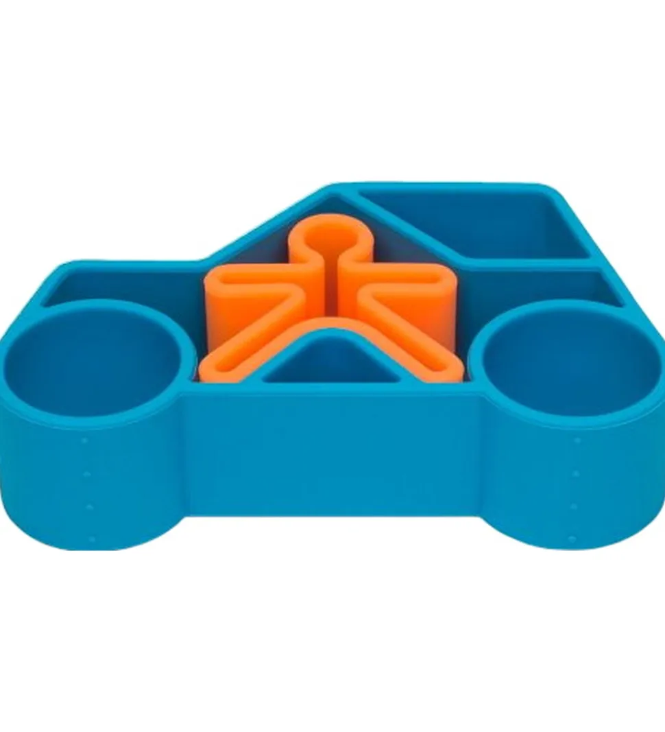 Smart Dëna bidelegetøj, som består af en blå bil og en orange figur, der passer ind i bilen.