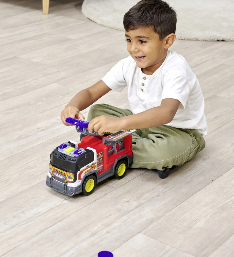 Dickie Toys brandbilen og kan sige rigtige lyde og lyse, når der trykkes på en knap. Den har en stige, der kan foldes ud og hjul, som kan dreje rundt. For enden af stigen er der også en skive-skyder med to medfølgende skiver.