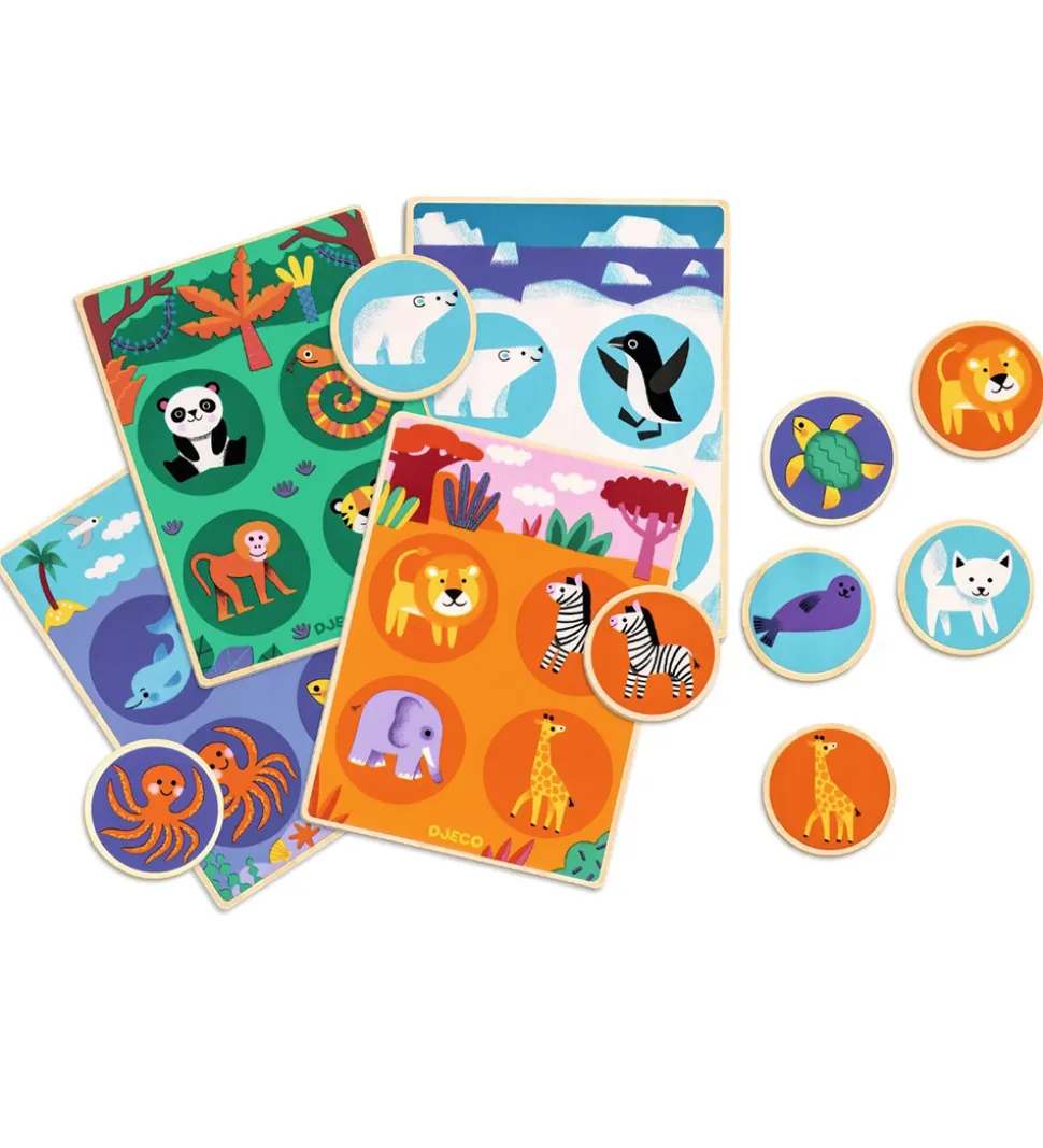 Lærerigt Djeco banko spil, bestående af fire plader og 16 vendebrikker.