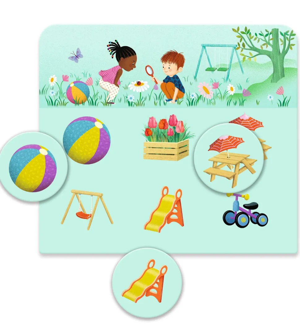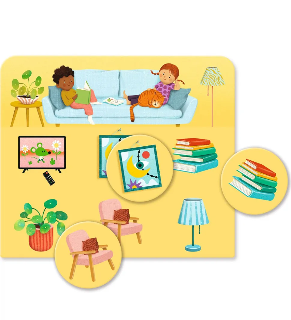 Lærerigt Djeco banko spil, bestående af fem plader og 30 vendebrikker.