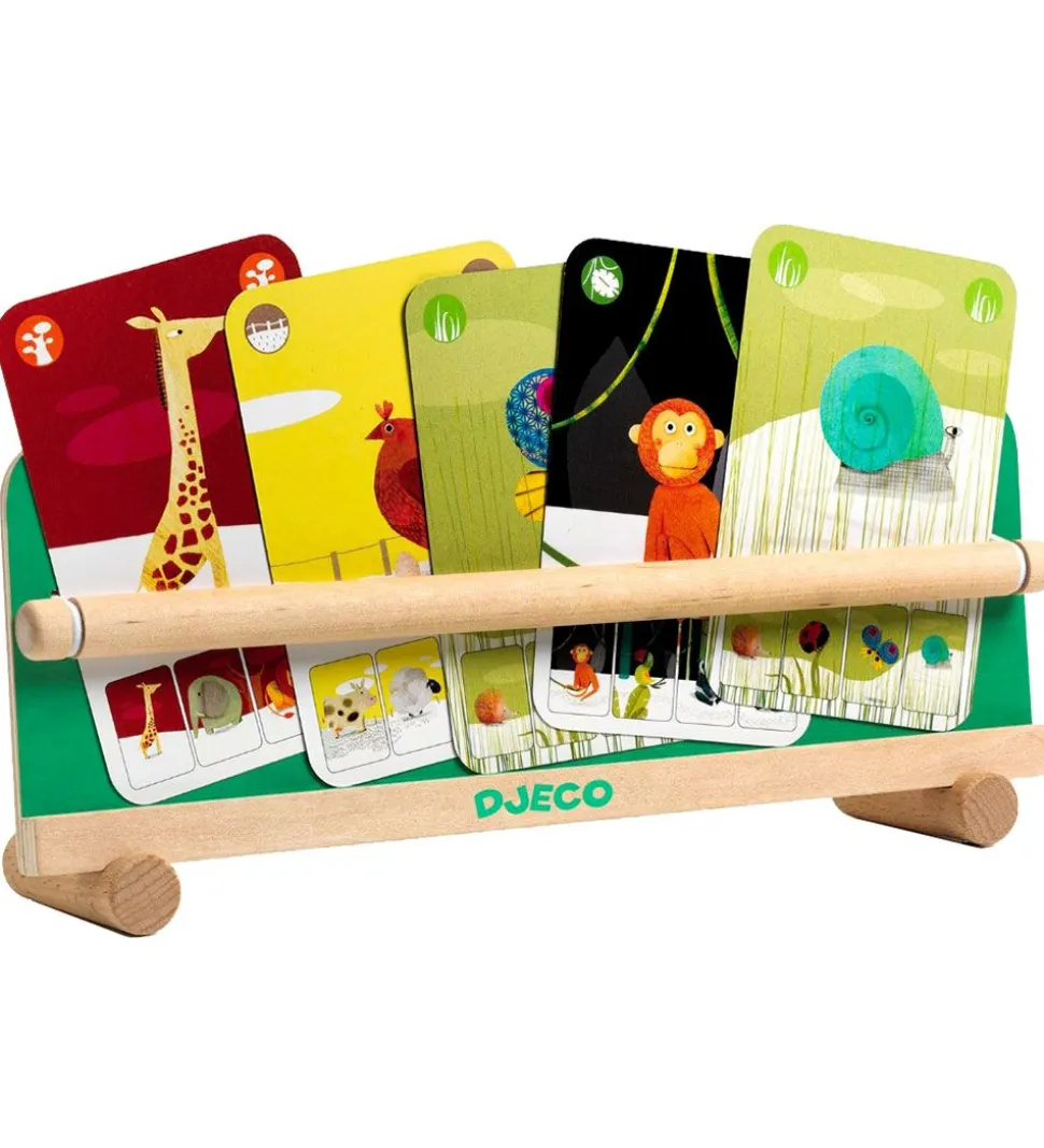 Djeco bordkortholderen er perfekt når de små, skal være med til kortspil. Bordkortholderen har to ben, så den kan stå stabilt på bordet. På den ene side er der en lang ping med elastikker i hver ende, så den kan holde på kortene. Denne gør det nemmere for børnene at overskue deres kort.
