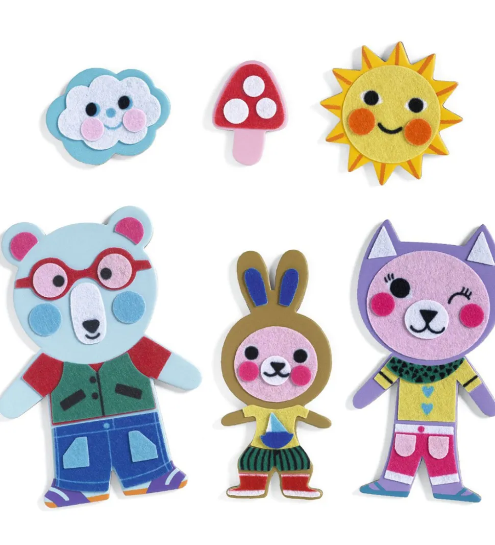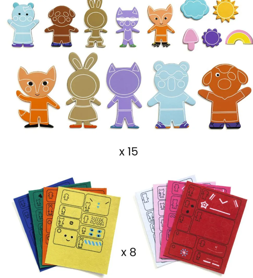 Djeco kreasætter styrker barnets finmotorik ved at barnet selv kan dekorere 15 forskellige dyr med de inkluderede klistermærker med filt.