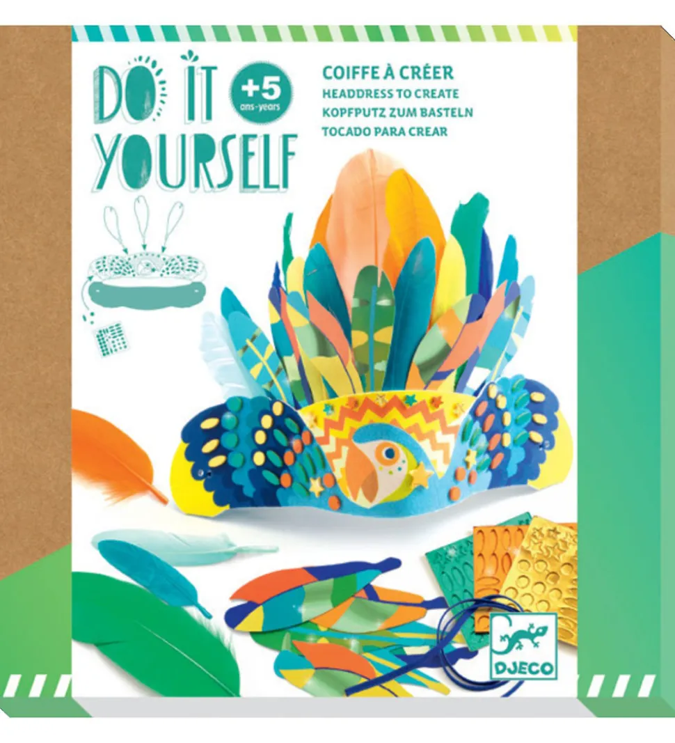 Djeco sættet består af 1 flot hat, fjer og selvklæbende klistermærker med metalliske reflekser. Derudover medfølger der også en snor til at binde på hatten, så den kan sidde om hovedet.