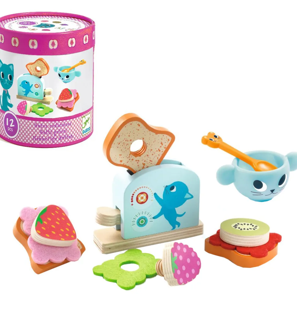 Djeco legemaden består bl.a. af en brødrister, en kop og forskellige dele mad, som kan samles på forskellige måder. Brødristeren har et lille håndtag i den ene side, for en ekstra detalje.
