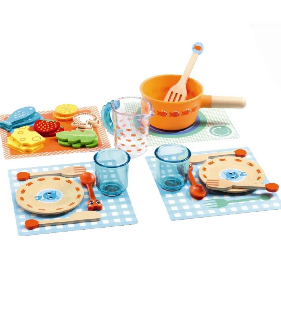 Sødt Djeco legemad af træ med service, der er dekoreret med fisk.