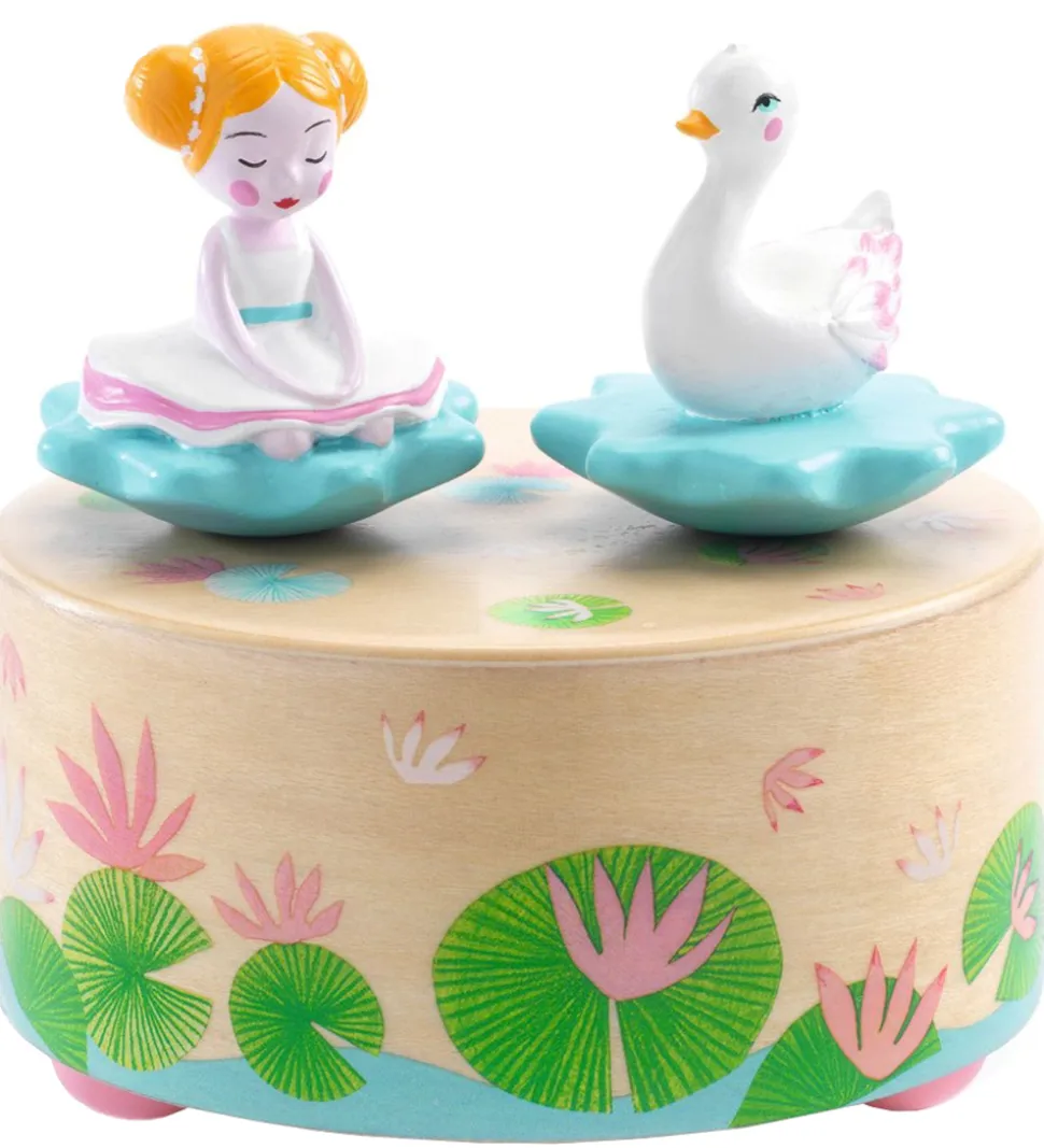 Djeco musikboksen har en rund form med korte pinke ben. Ovenpå boksen er to magnetiske figurer, en hvid svane og en ballerina, begge siddende på en blå platform og som vipper og drejer når musikken spilles. Musik boksen bliver trukket op på bagsiden og spiller den velkendte melodi Svanesøen af Tchaikovsky.
