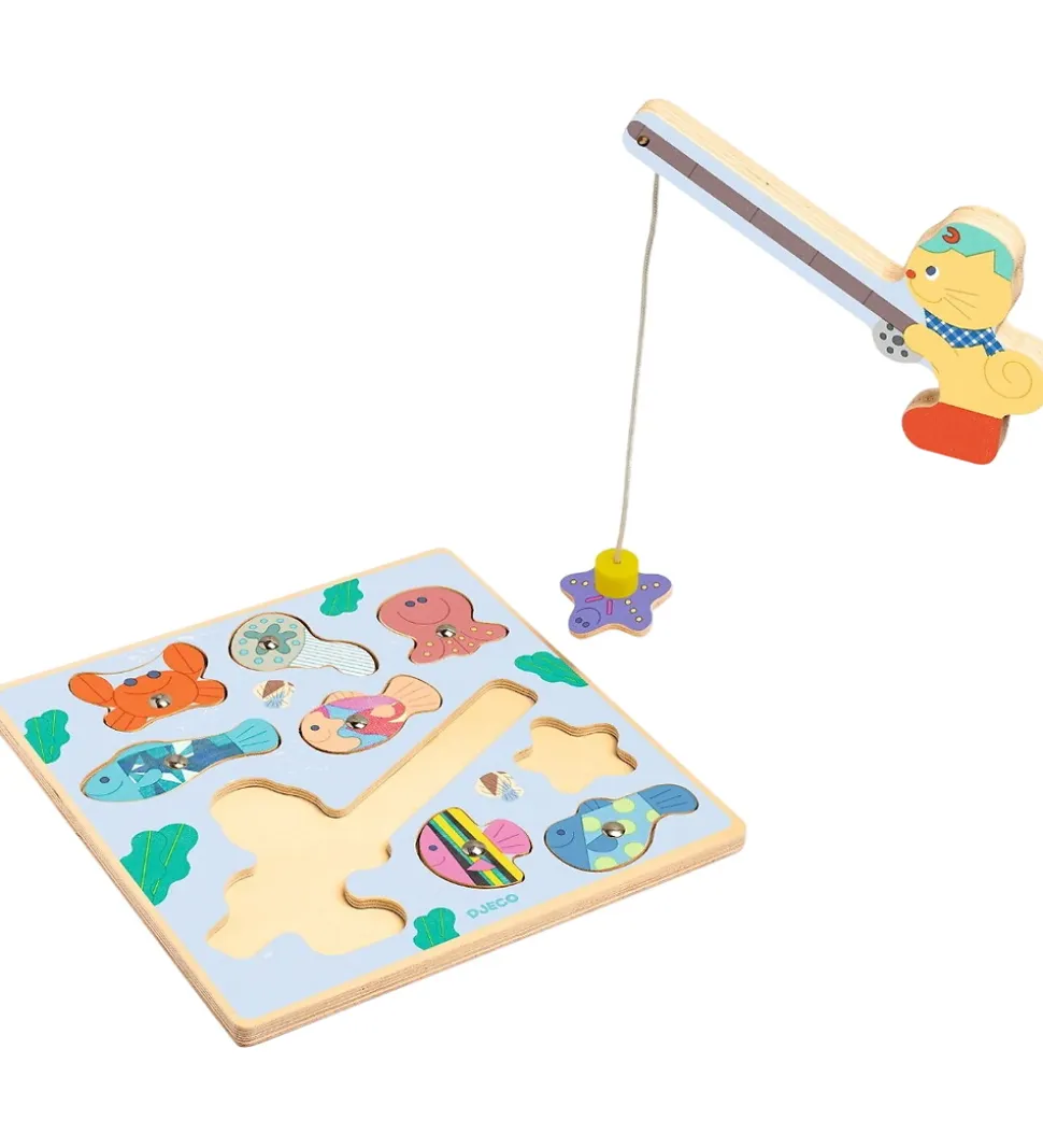 Djeco legetøjet består af 6 træfisk med en lille magnet, som skal fiskes op af æsken med en fiskestang med en magnet på fiskekrogen.